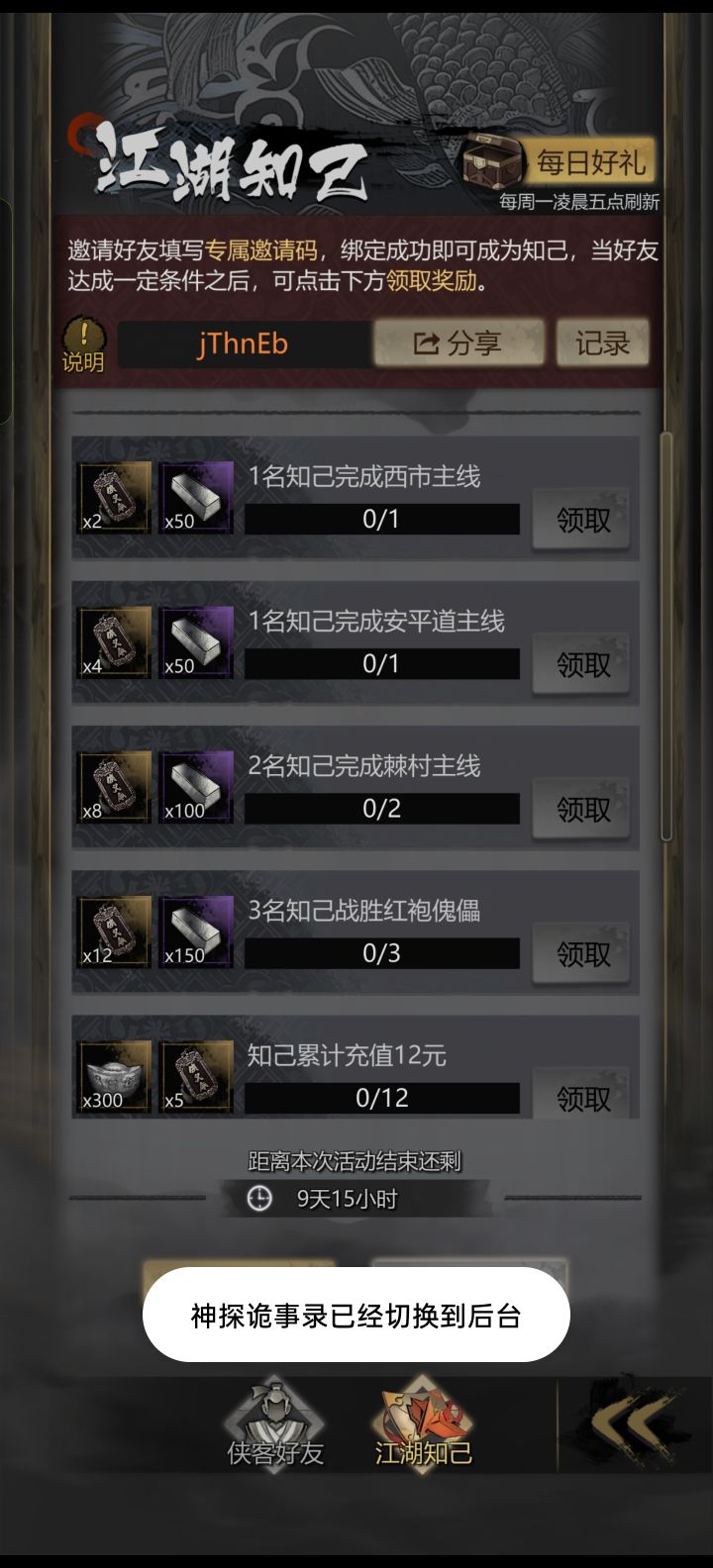 点击好友——江湖知己——输入邀请码bbsJgF即可获得巨额奖励!新玩家快去输入吧#神探诡事录 #神探诡事录bug #神探诡事录组队