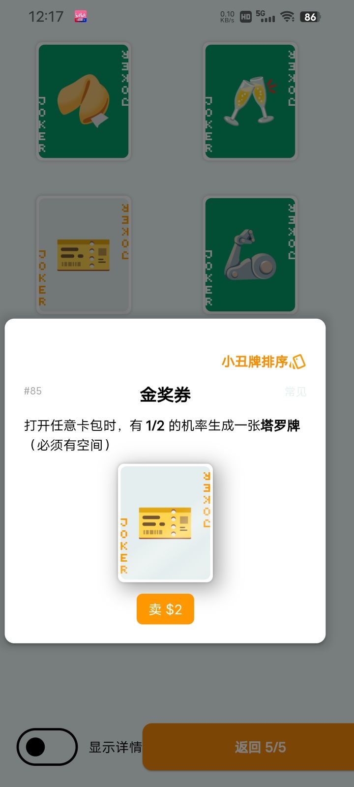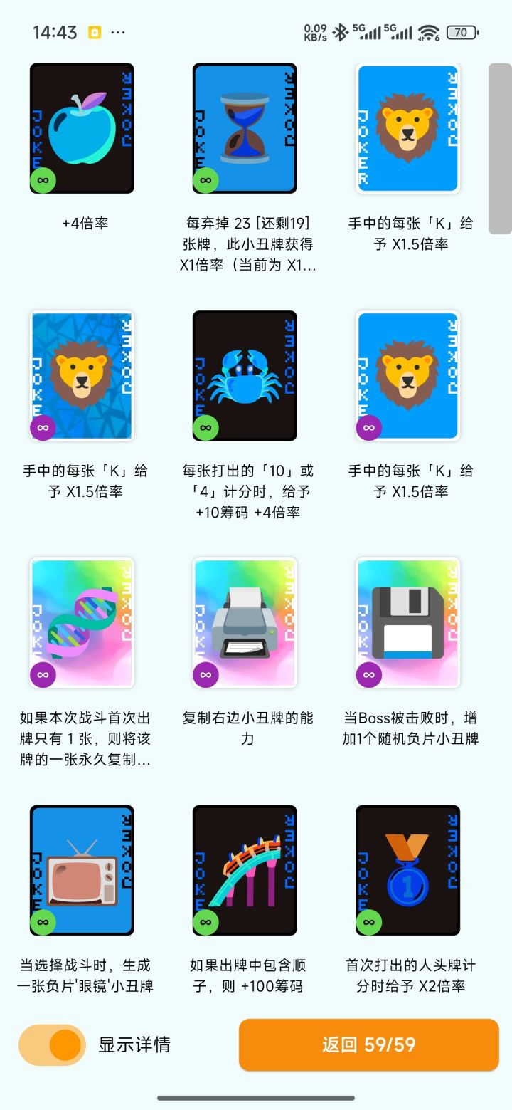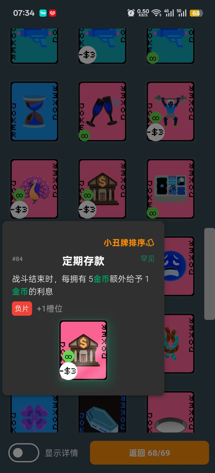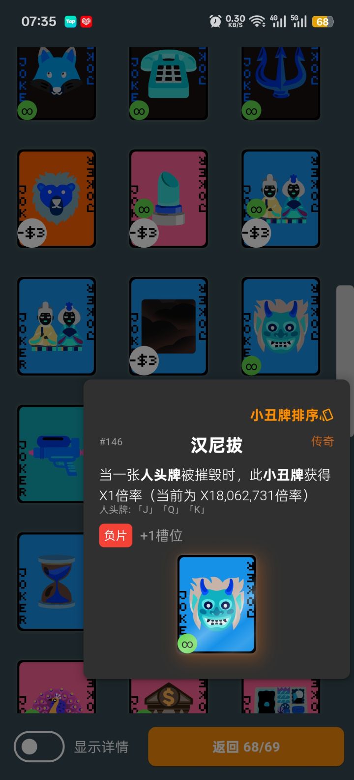 #小丑牌 #小丑牌balatro #小丑牌攻略 核心卡牌: 五星市民(稀有):战斗结束时,获得持有金币12%的利息,每连续战斗+3%(倍率可以无限增加) 郁金香效应(罕见):每拥有5金币可获得+2倍率(无上限) 金钱即力量(罕见):每拥有1金币可获得+2筹码(无上限) 增伤卡牌: 复印机(稀有):复制右边小丑牌的能力(放“五星巿民”小丑牌前面,刷钱更快) 功率放大器(史诗):成长型小丑牌成长速度