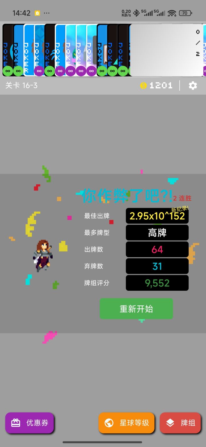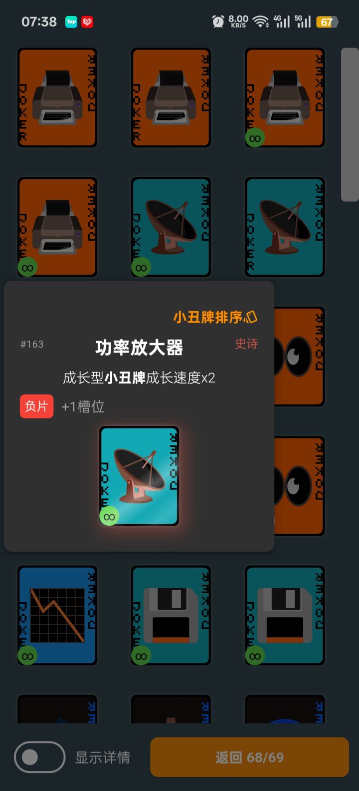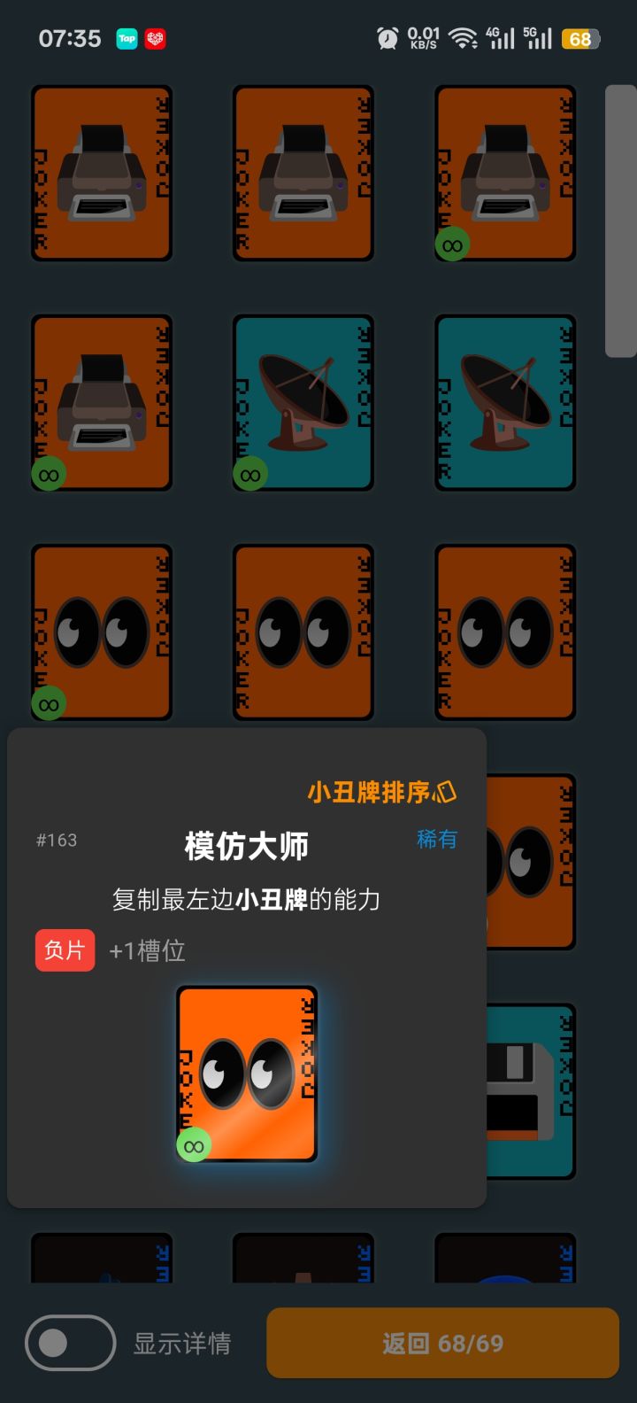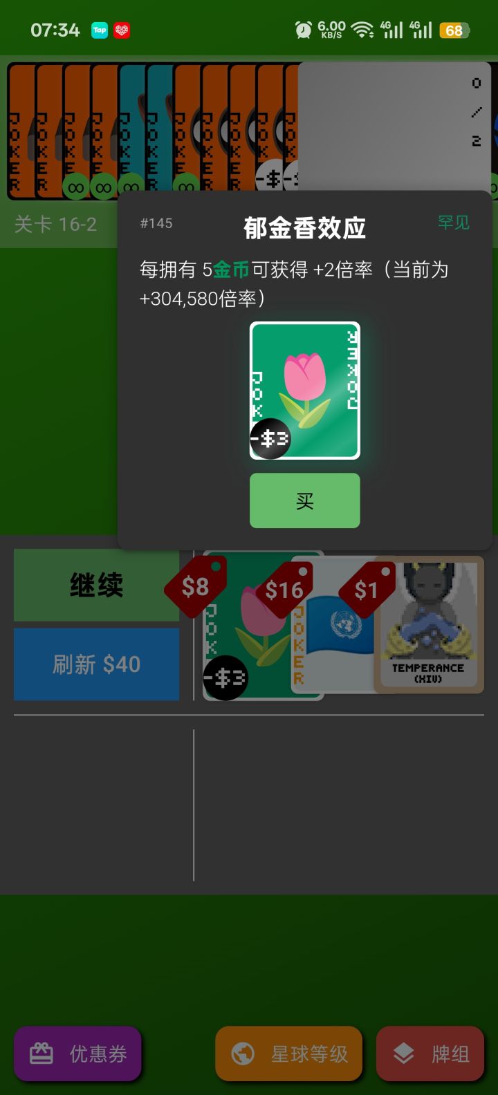 #小丑牌 #小丑牌balatro #小丑牌攻略 核心卡牌: 五星市民(稀有):战斗结束时,获得持有金币12%的利息,每连续战斗+3%(倍率可以无限增加) 郁金香效应(罕见):每拥有5金币可获得+2倍率(无上限) 金钱即力量(罕见):每拥有1金币可获得+2筹码(无上限) 增伤卡牌: 复印机(稀有):复制右边小丑牌的能力(放“五星巿民”小丑牌前面,刷钱更快) 功率放大器(史诗):成长型小丑牌成长速度
