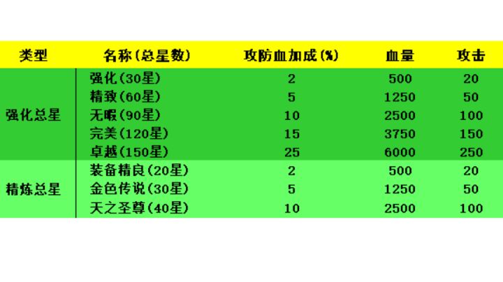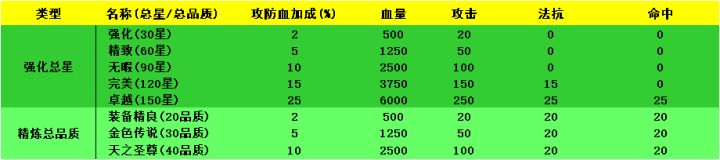 ① 通过精炼和强化则可以出现套装加成,仅看总星数和总品质,不看装备类型和等级。套装等级由精炼及强化等级决定,加成值为两者的和。如下图。② 铭刻系统的等级与消耗关系为:总消耗=等级^1.5