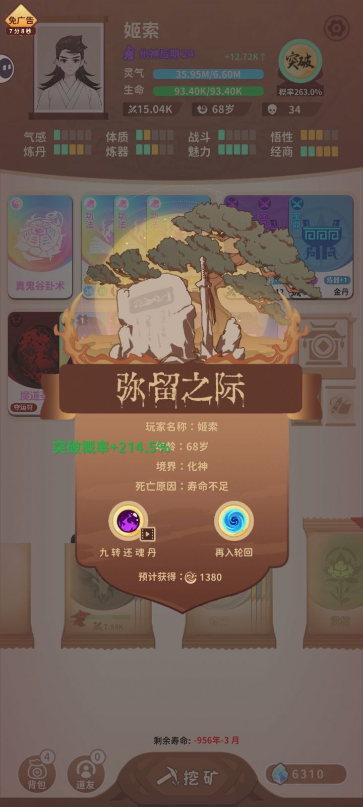 开局属性气感悟性拉满,视频广告加成一定要刷出修行速度20% ,剩下属性点战斗和魅力。(图四和图五是较为合适的开局)然后传承选择真鬼谷刷出一个气运不算太低儒或者邪道友,词条选择加功法感悟品质的 然后游戏过程中最好前三个卡包有灵兽,帮助度过前期以及靠境界压制秒怪速通 境界压制的具体实施方法如图三,保证在第四个卡包出现时没突破(卡包里面的内容在出现时就决定了,这样可以保证比怪高两个小境界以上) 道