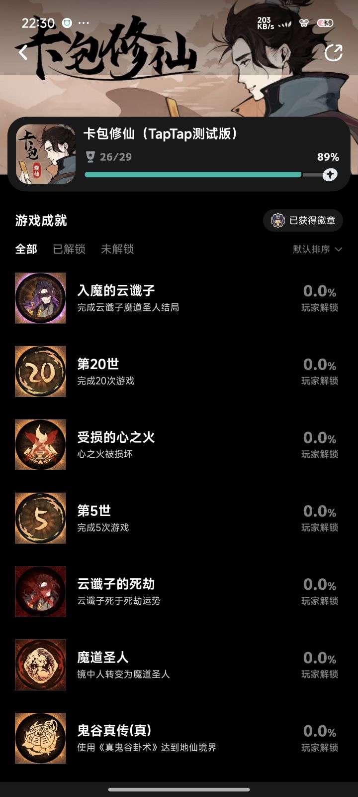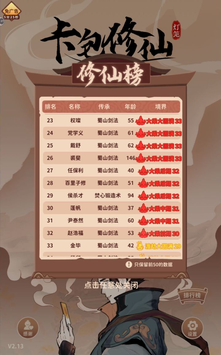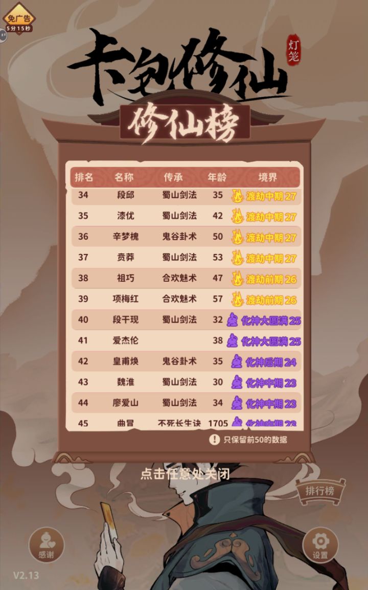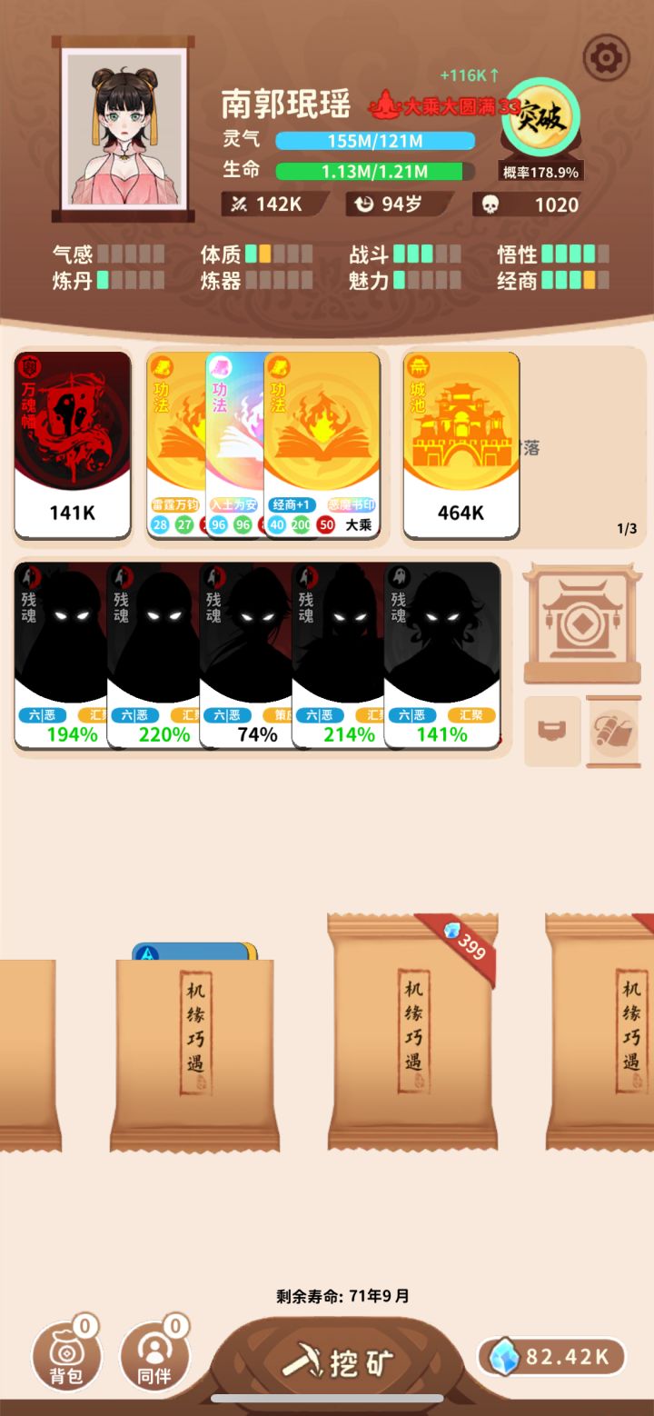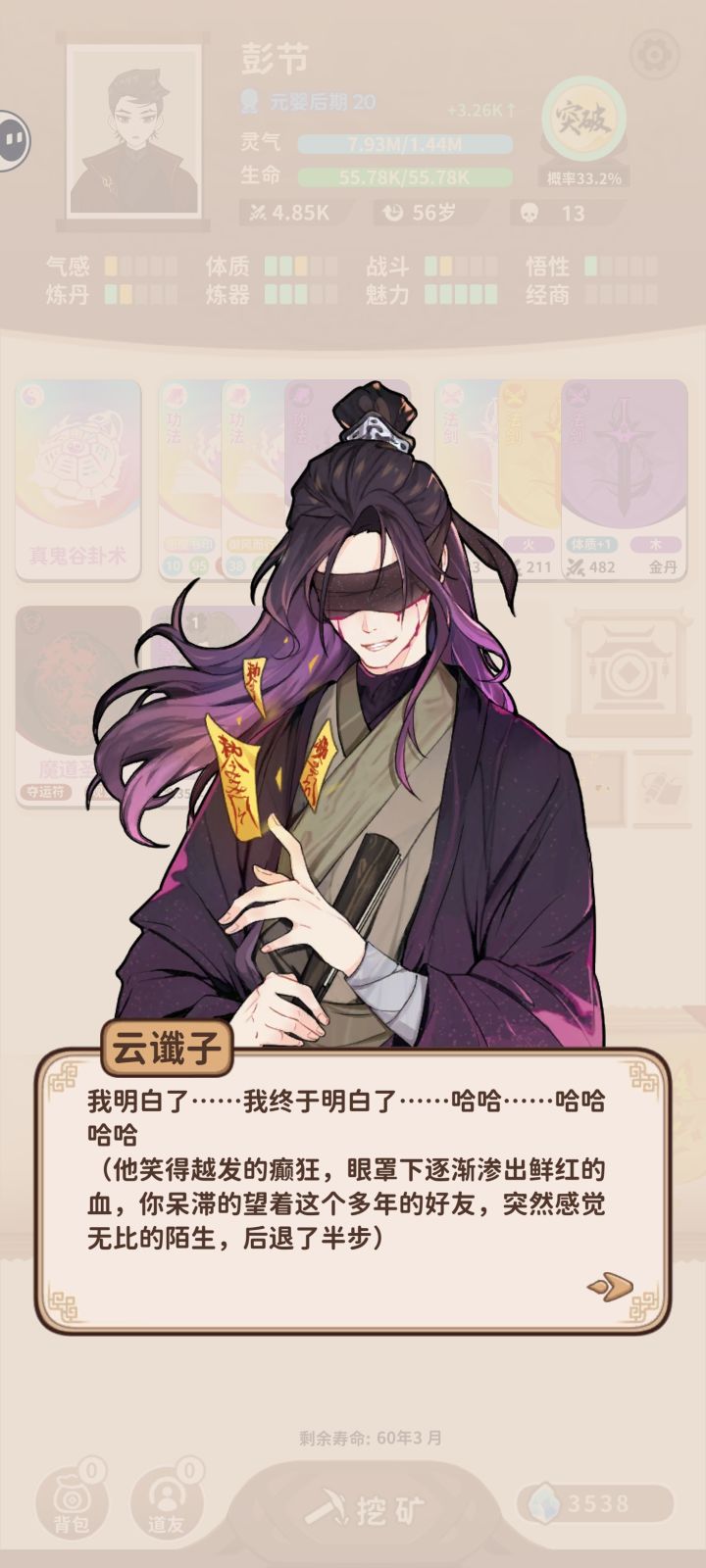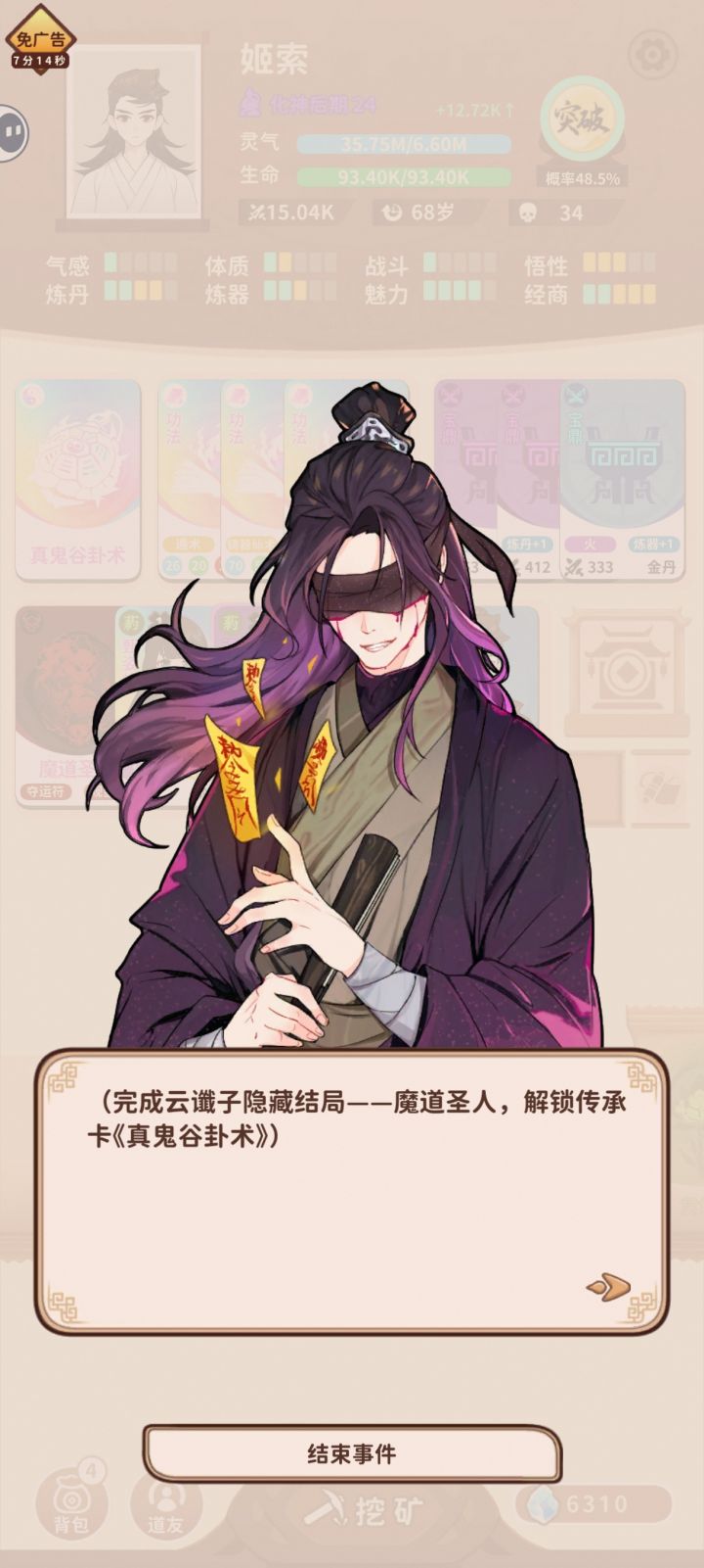 建议先看完真鬼谷卦术攻略。 传承要选真鬼谷卦术,刷魅力3~4点 伙伴刷新推荐如图二死劫(不用看气运)最好 伙伴卡左上角为气运,1点气运恶运次之 其他的运气什么的别要(这成就开局要让3个伙伴死然后就会变成魔道圣人)开局先不要突破等云谶子的第一次来 然后来到实力练气选择加一个伙伴(不喜欢看广告的可以不要)然后你的一点运气伙伴卡先不要丢 等他死加灵气(你有更好的伙伴品质,词条可丢,(粘人的