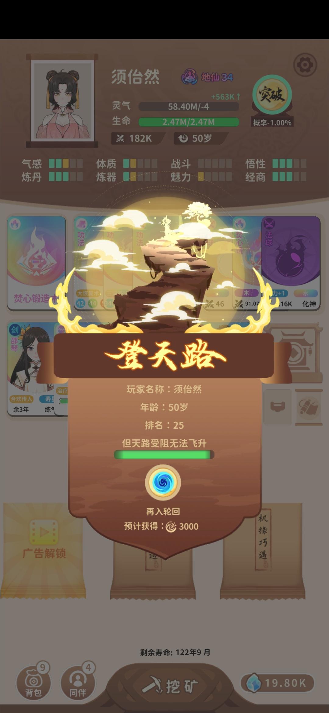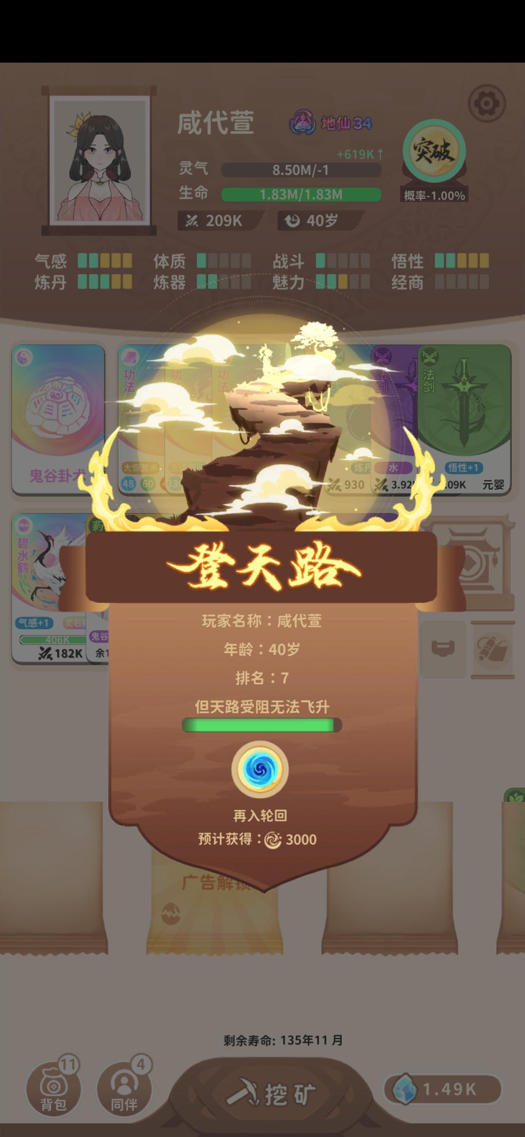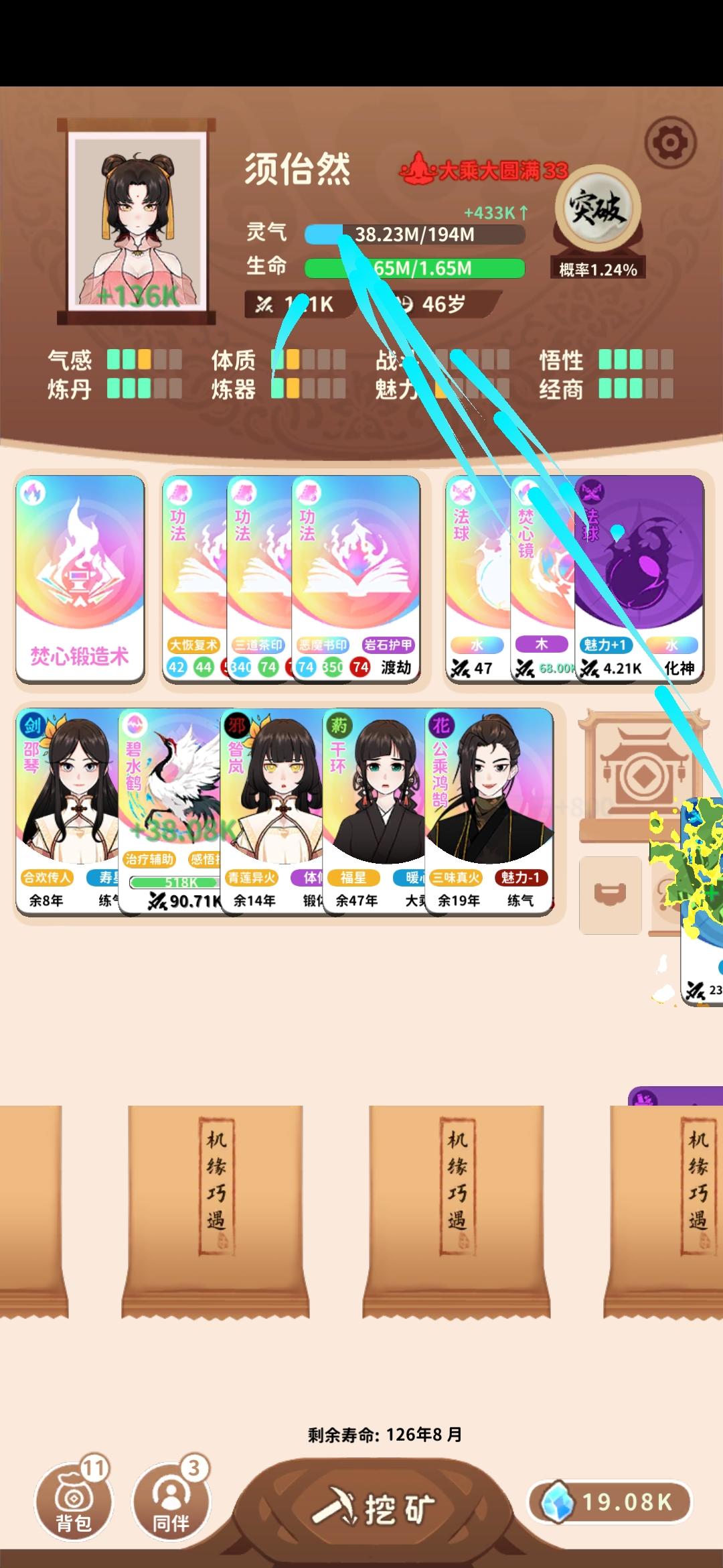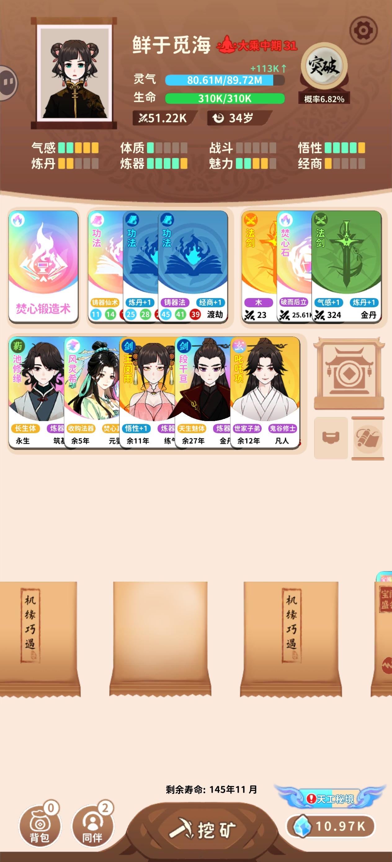 #攻略 rt,先放一下我的54岁地仙,理论上44岁也可以,34岁也能试着冲一冲原理是金耀宝库能免费拿彩色突破丹,世家子弟能刷新宝库,刷新次数足够多的话突破丹数量就很可观,如果灵气还够的话能一路突破至地仙,但前期的灵气往往不够攒下连破好几级的,更别提从渡劫初期一路升至地仙,宝库期间又不能额外获取灵气,但是焚心锻造法可以吞噬彩色法器获得足够多的灵气,这一问题自然就解决了。经测试,至少得3个世家子弟