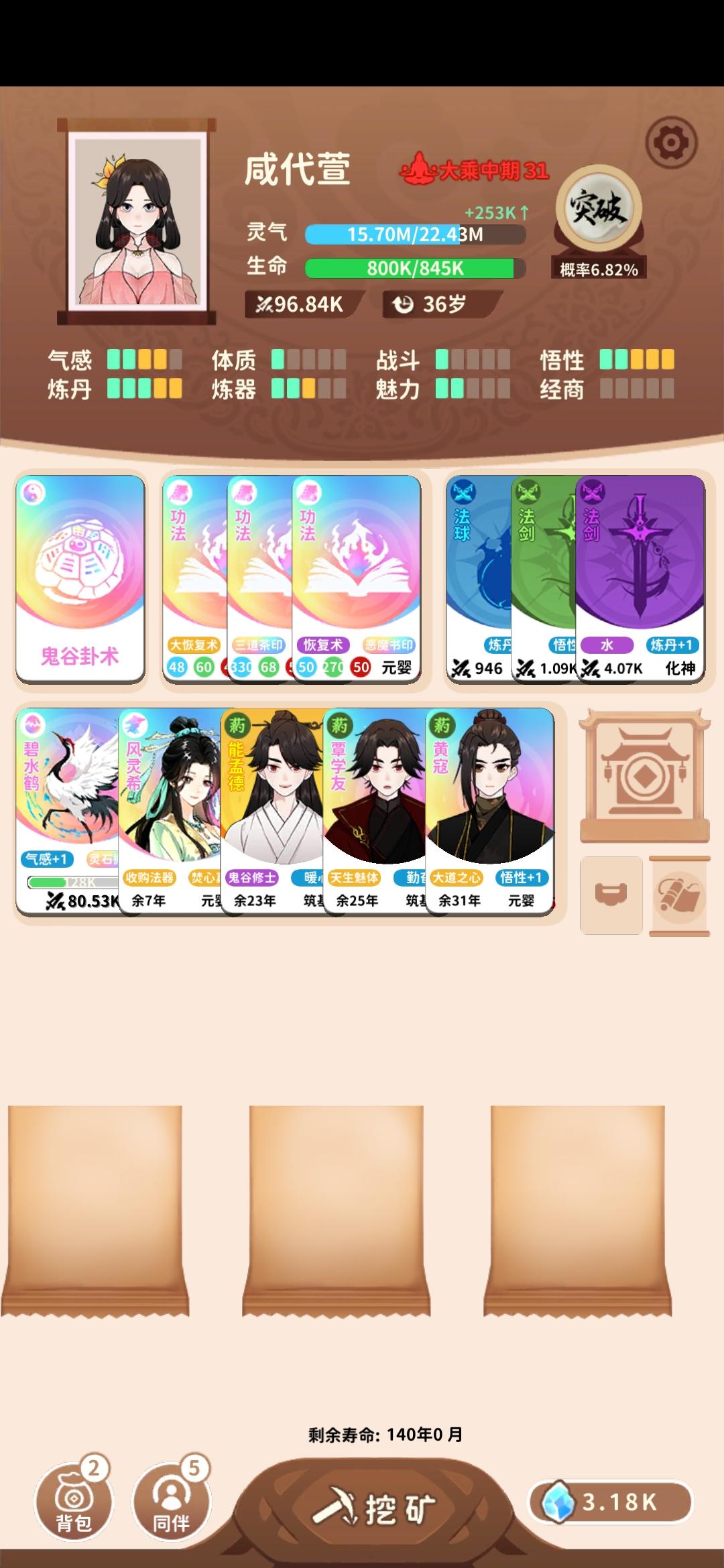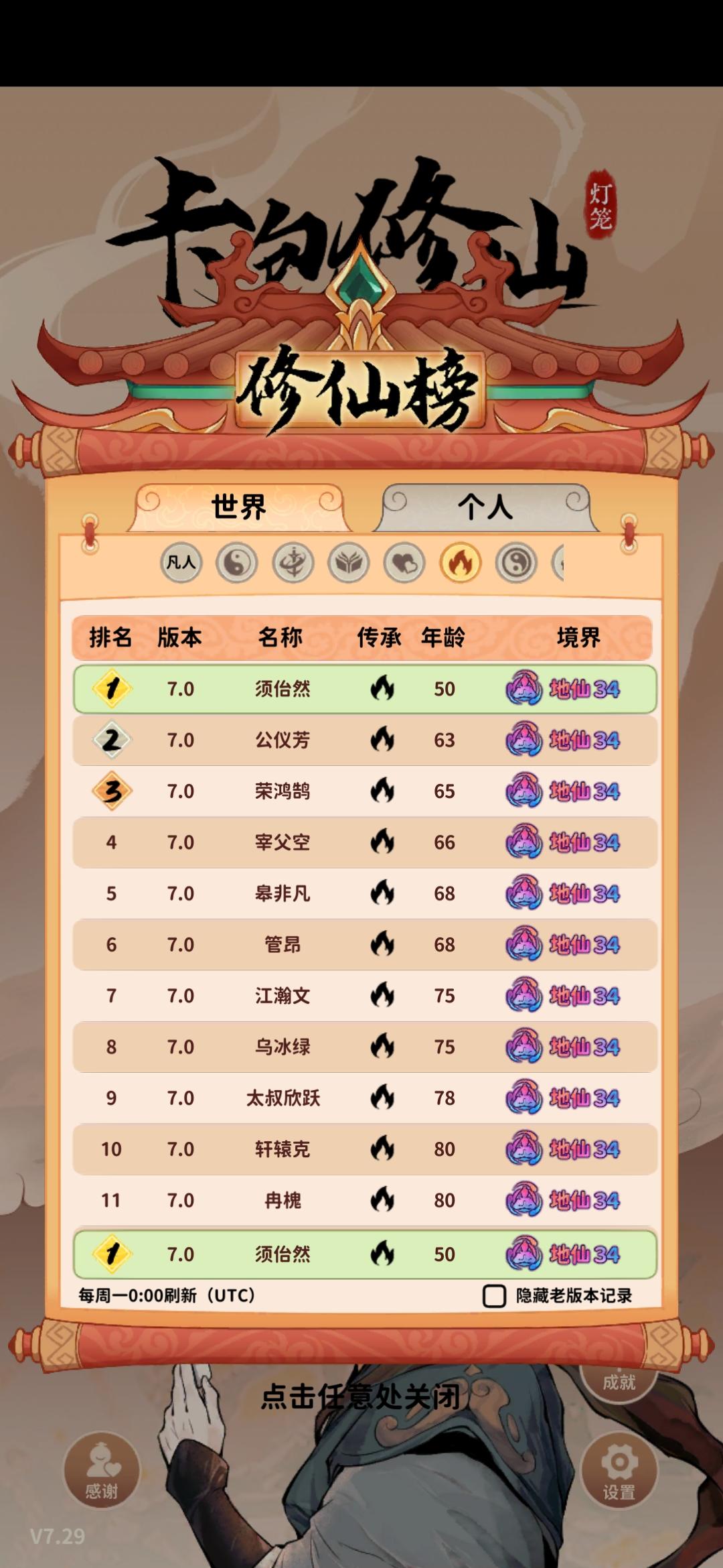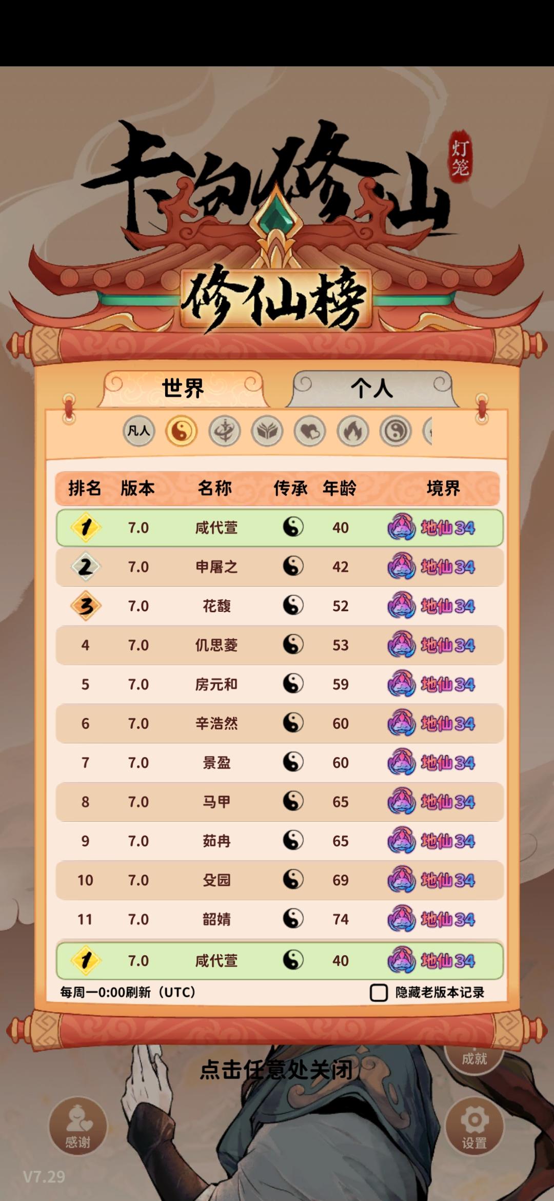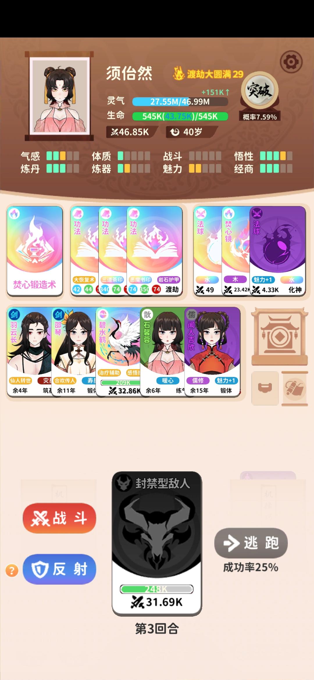 #攻略 rt,先放一下我的54岁地仙,理论上44岁也可以,34岁也能试着冲一冲原理是金耀宝库能免费拿彩色突破丹,世家子弟能刷新宝库,刷新次数足够多的话突破丹数量就很可观,如果灵气还够的话能一路突破至地仙,但前期的灵气往往不够攒下连破好几级的,更别提从渡劫初期一路升至地仙,宝库期间又不能额外获取灵气,但是焚心锻造法可以吞噬彩色法器获得足够多的灵气,这一问题自然就解决了。经测试,至少得3个世家子弟