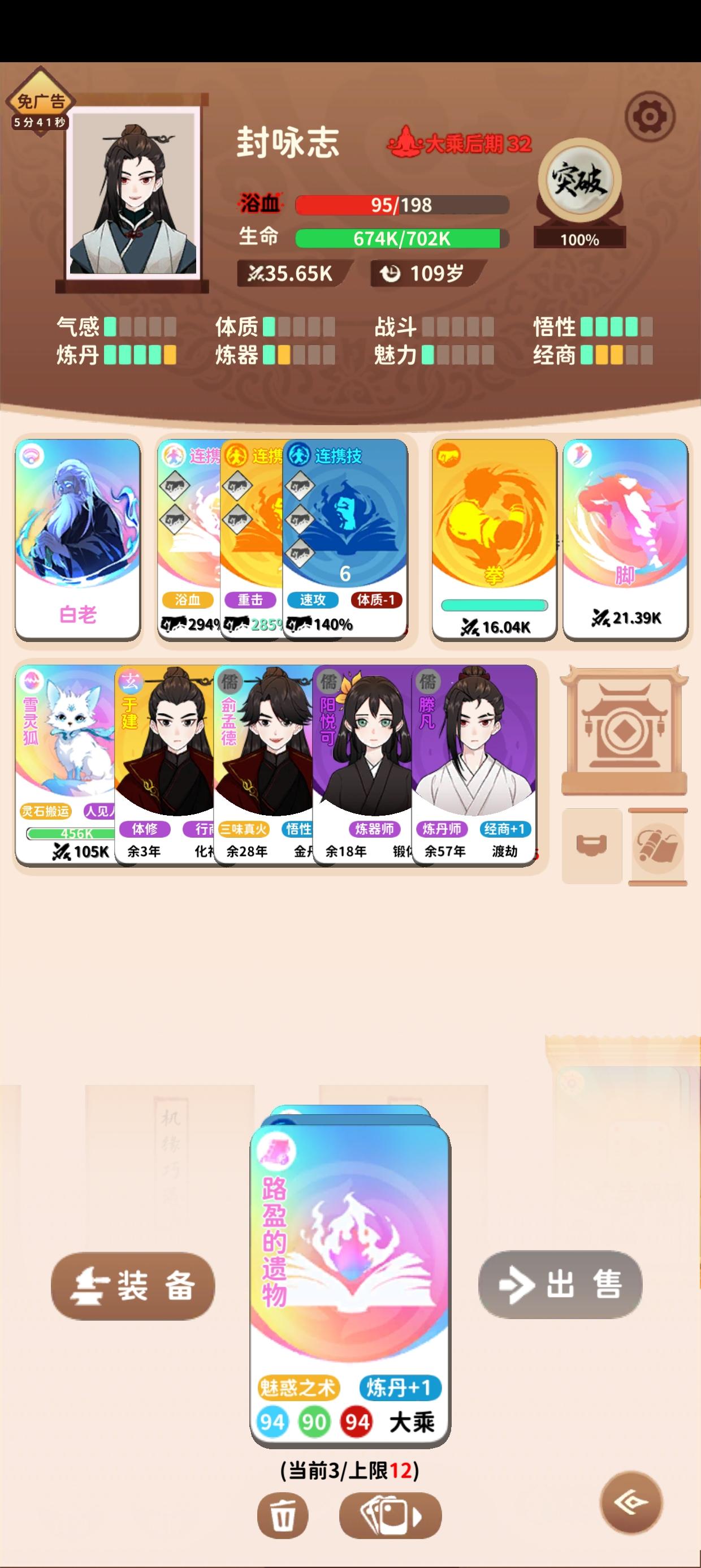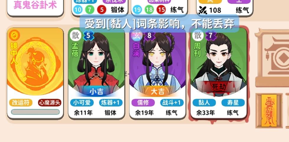 个人DIY,已发送给官方,被采纳几率不高,大家可以先当个乐子看看——新传承:万世轮回功——无法获取灵力,每次死亡后会重新复苏并提升境界——轮回: 因灾厄/敌人 死亡时会重新复苏并提升3/1个小境界—通幽: (获得 替死咒 cd:6个月) 同伴下一个运势为死劫时,可以使用替死咒替死,复苏后自身随机天赋+1,寿命+5年—阴气缭绕: 敌人战斗力下降20%,结交同伴概率降低20%—天