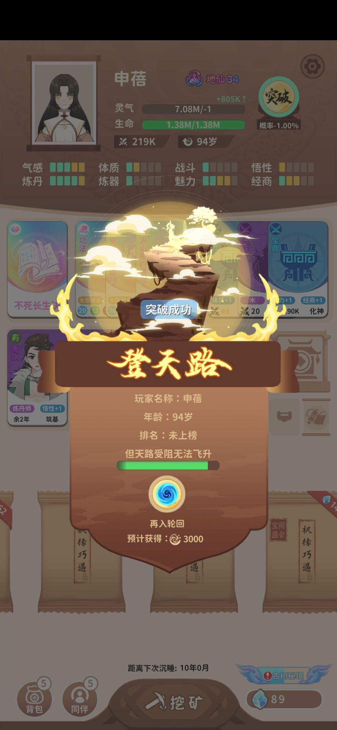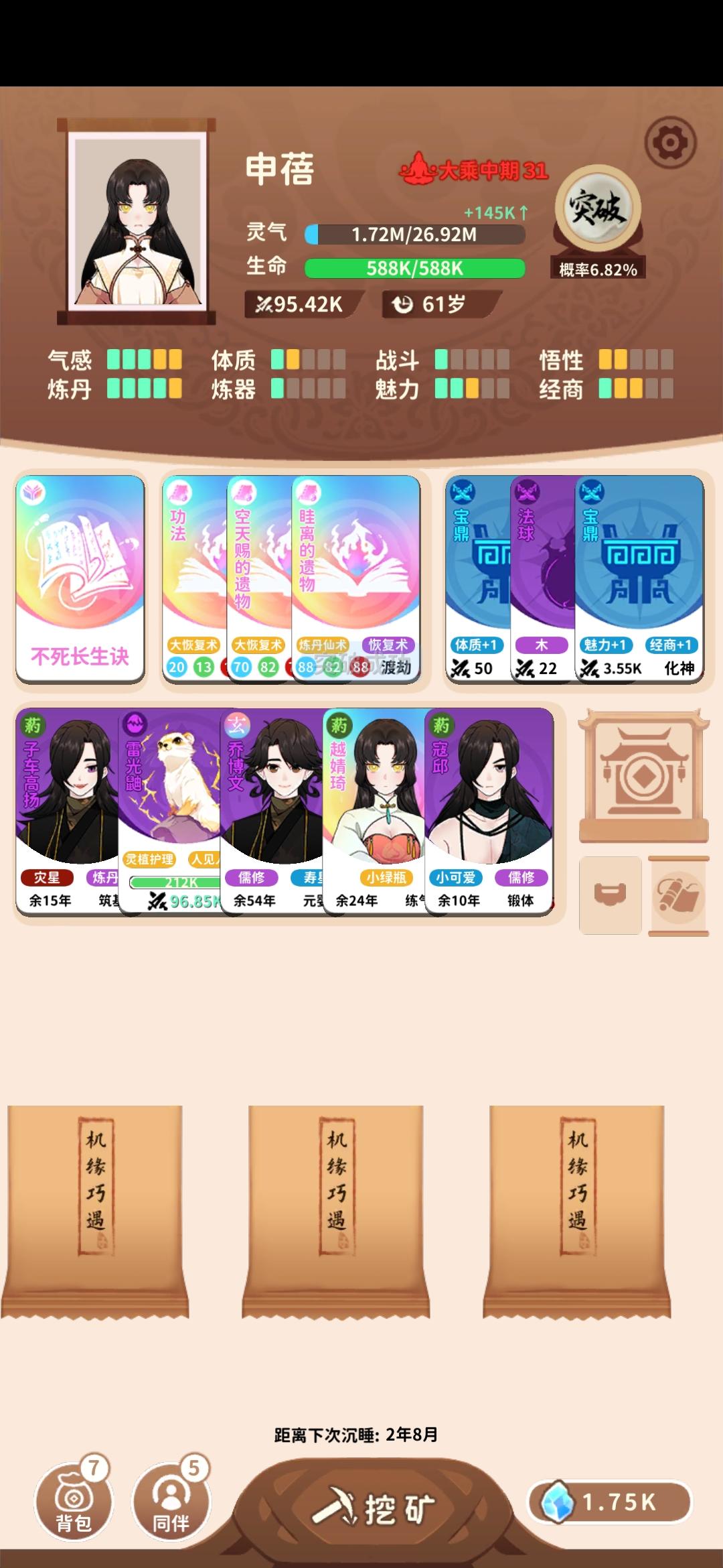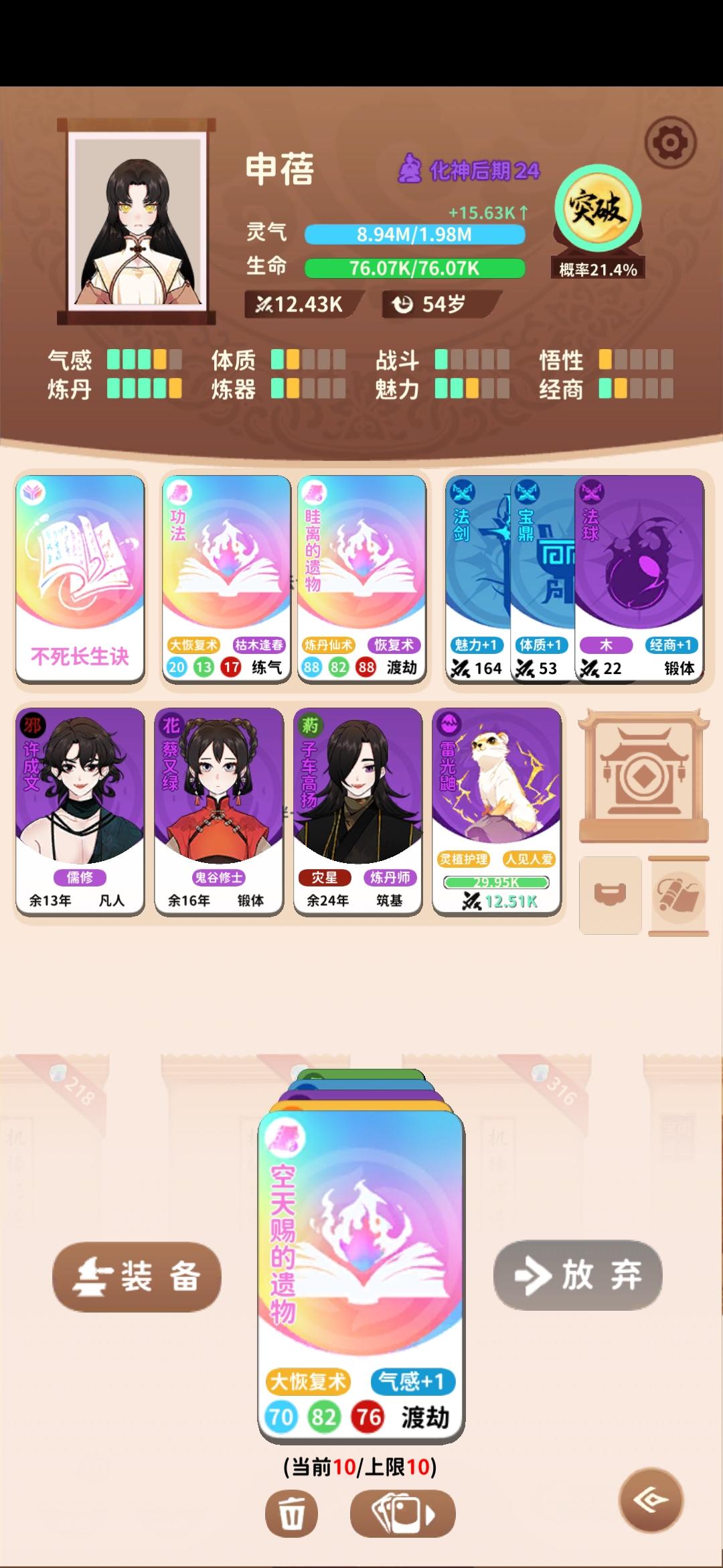 这把开局功法大恢+枯逢,因为没觉得会破纪录,所以没开截开局的图。roll点侧重炼丹气感魅力。 炼丹要满,要刷榜气感最好也满,魅力够用就行。 配置如p3。这把运气真的很好,第一次沉睡之后,伙伴们就送了两个彩色渡劫期大恢+恢复功法。 60出头大乘中期但没死成,玩惯蜀山了,总以为最后一张牌是怪,结果快到最后期限了,连开两卡包,没有一个怪找死失败,不然理论上60岁就能飞升。无奈又睡了一