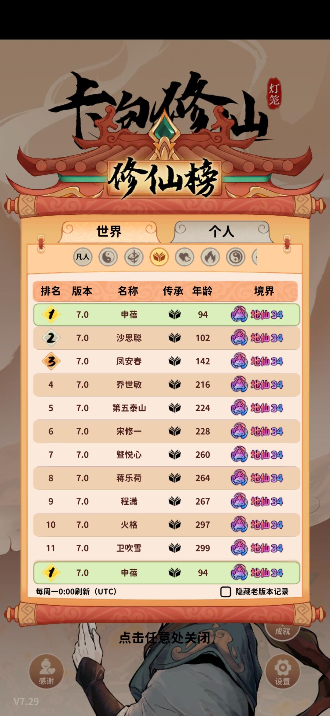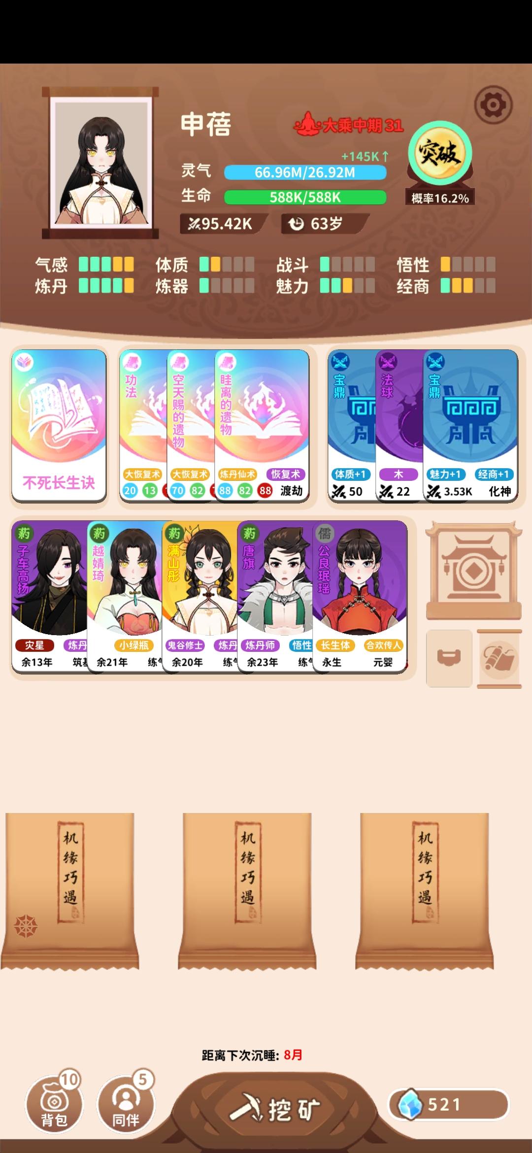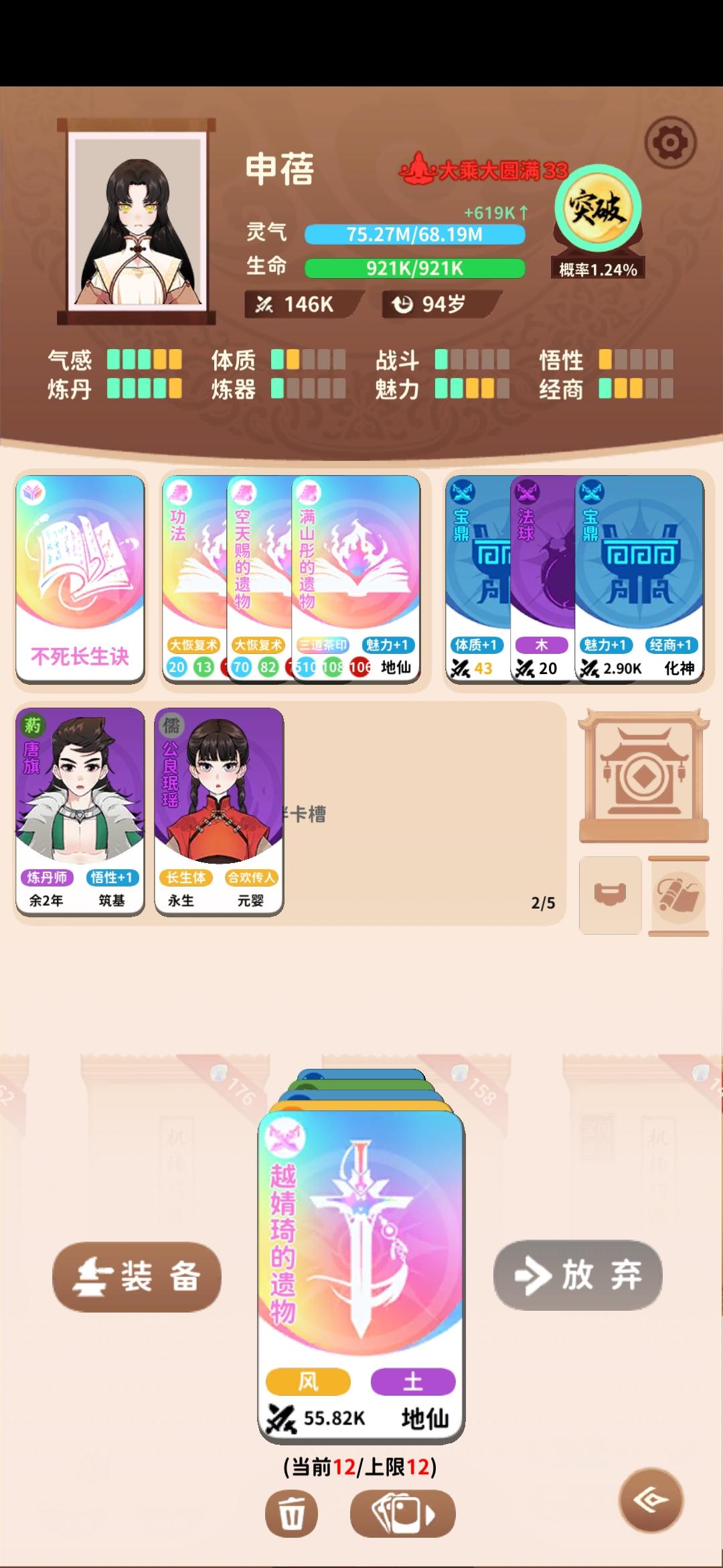 这把开局功法大恢+枯逢,因为没觉得会破纪录,所以没开截开局的图。roll点侧重炼丹气感魅力。 炼丹要满,要刷榜气感最好也满,魅力够用就行。 配置如p3。这把运气真的很好,第一次沉睡之后,伙伴们就送了两个彩色渡劫期大恢+恢复功法。 60出头大乘中期但没死成,玩惯蜀山了,总以为最后一张牌是怪,结果快到最后期限了,连开两卡包,没有一个怪找死失败,不然理论上60岁就能飞升。无奈又睡了一