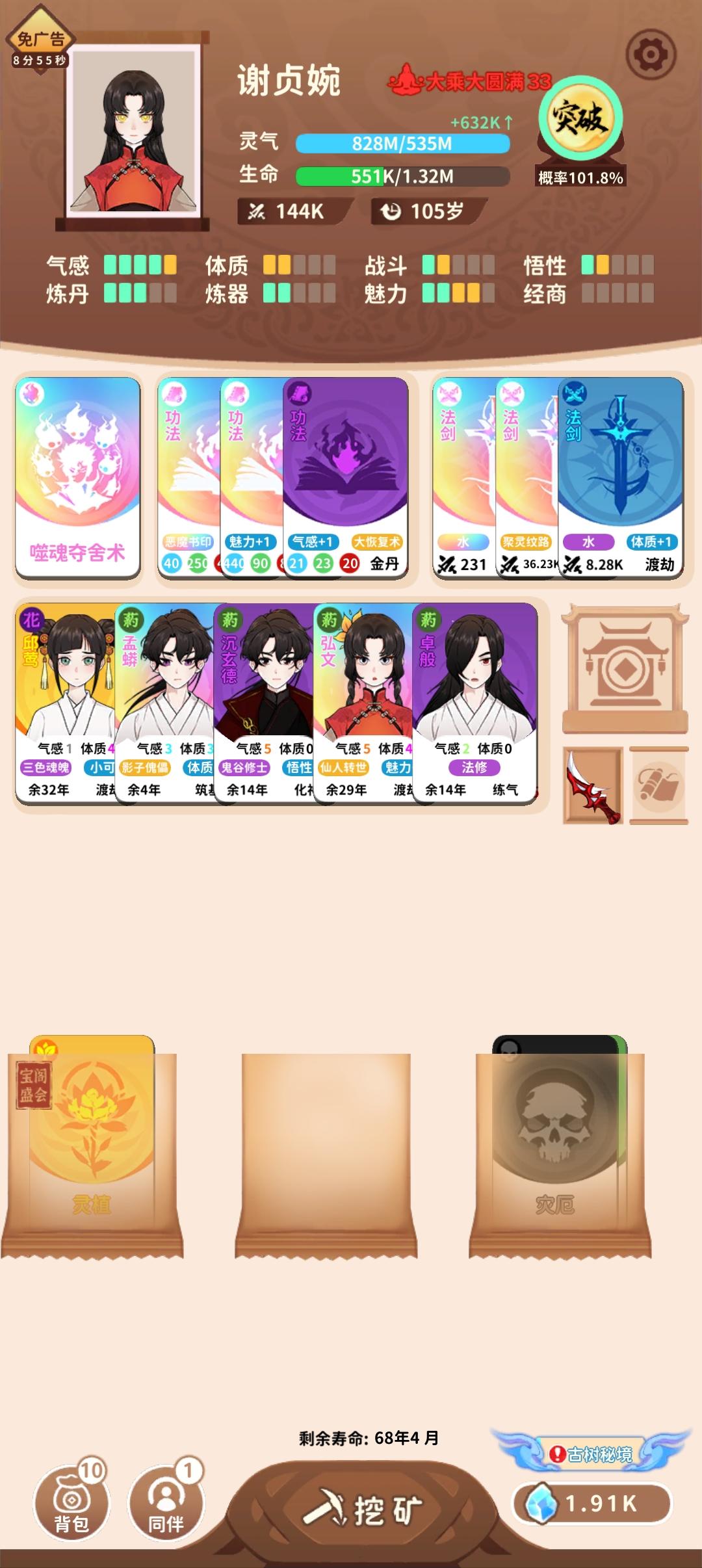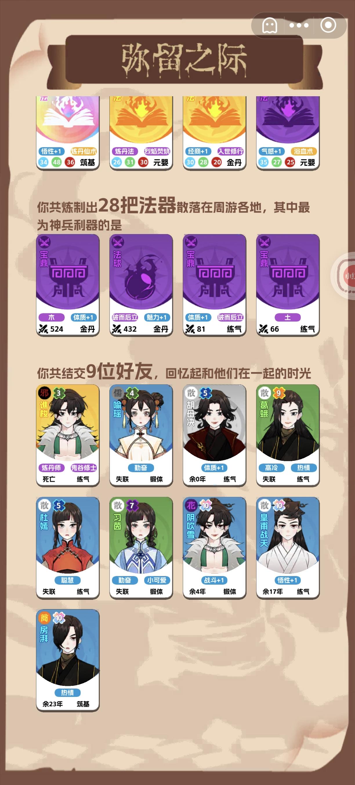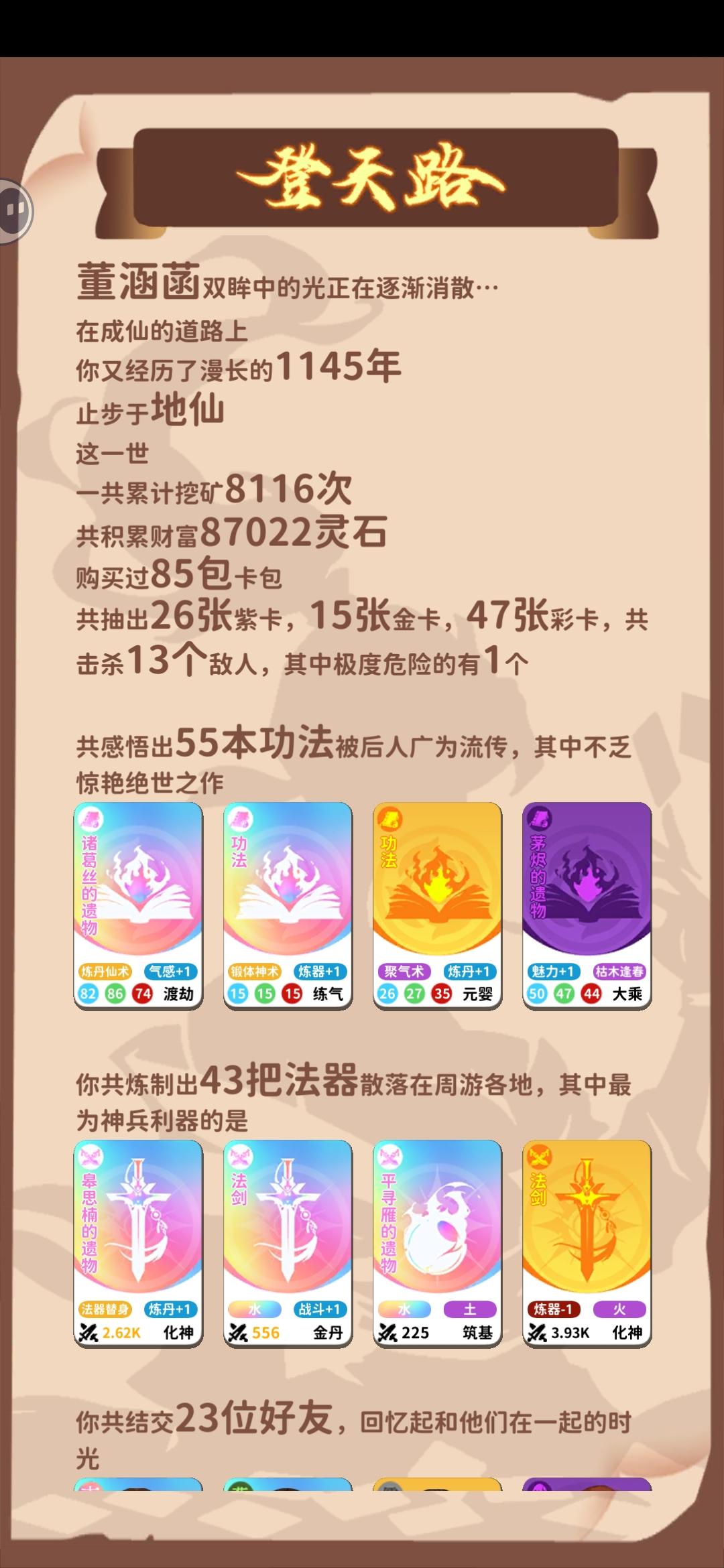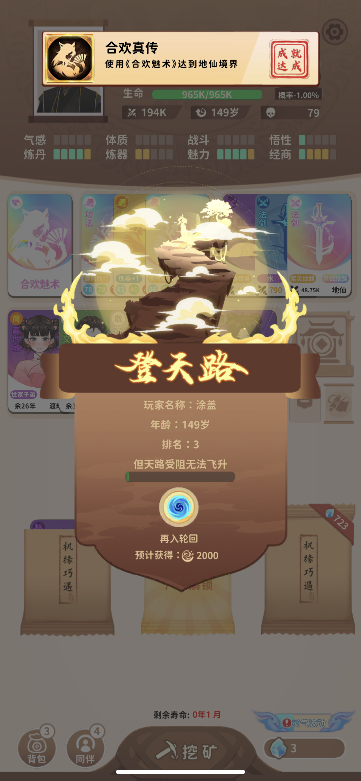 #合欢宗 #卡包修仙TapTap测试版 兄弟们,合欢宗才是真正的T0。 优先加点:天道里的财富、寿命。天赋里的资质、功法、同伴(增加功法同伴位置以及刷魅力)。传承里的天络(用来买同伴)。 财富是用来挖矿攒钱以及过卡,寿命是提升前期的容错率。 重点是这个天络,这个就是用来买同伴的,没错,1级的天络开卡可以直接1000买3个队友,同伴不够了直接开带有天络标记的卡包买同伴就完事了。