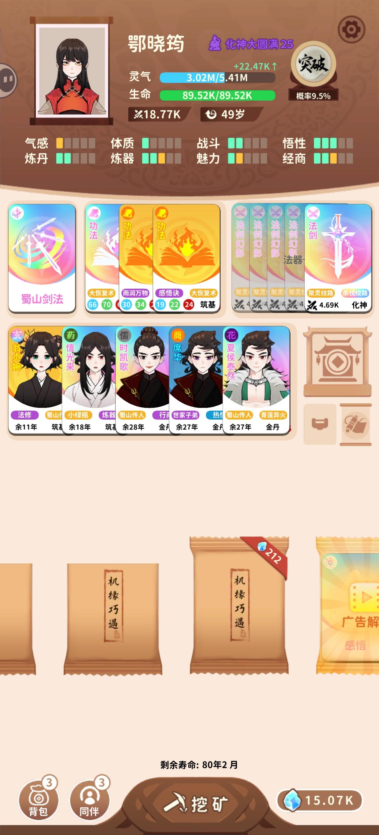 剑修好快还稳定,开局刷彩剑加大恢复,中途继续加大恢复或者恶魔书,生命越高灵力越快,这把运气好蜀山传人开,中途加了个枯木回春,大恢复和蜀山传人,15把剑吸灵力,缺点就是容易被封印型怪克制#卡包修仙TapTap测试版