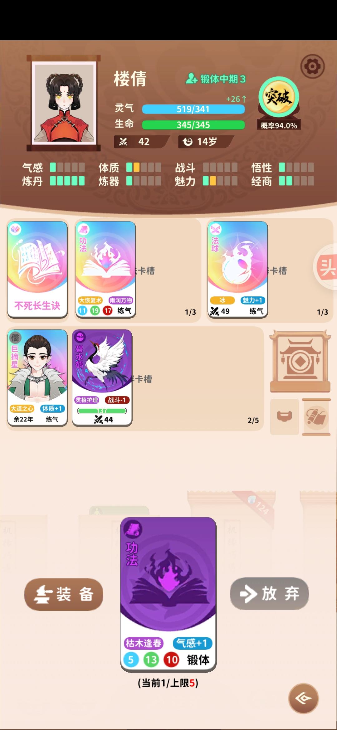 核心是速攻,傻瓜式玩法就是全选拳/脚,额外也只选一个就不会中断输出,招数越少越好,不必太看重词条,遇怪基本两波拿下,必要时可以sl感悟功法。#卡包修仙TapTap测试版