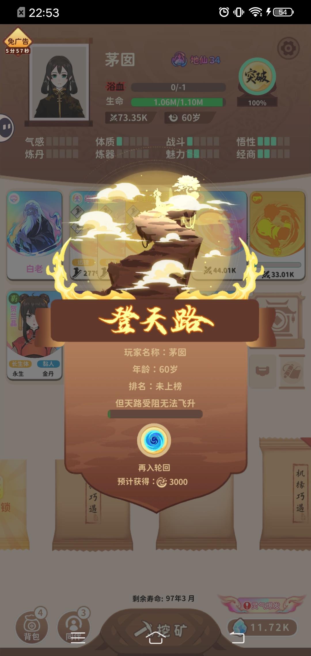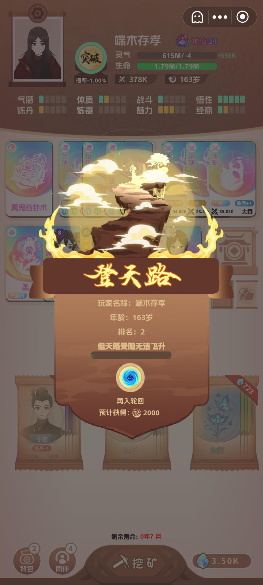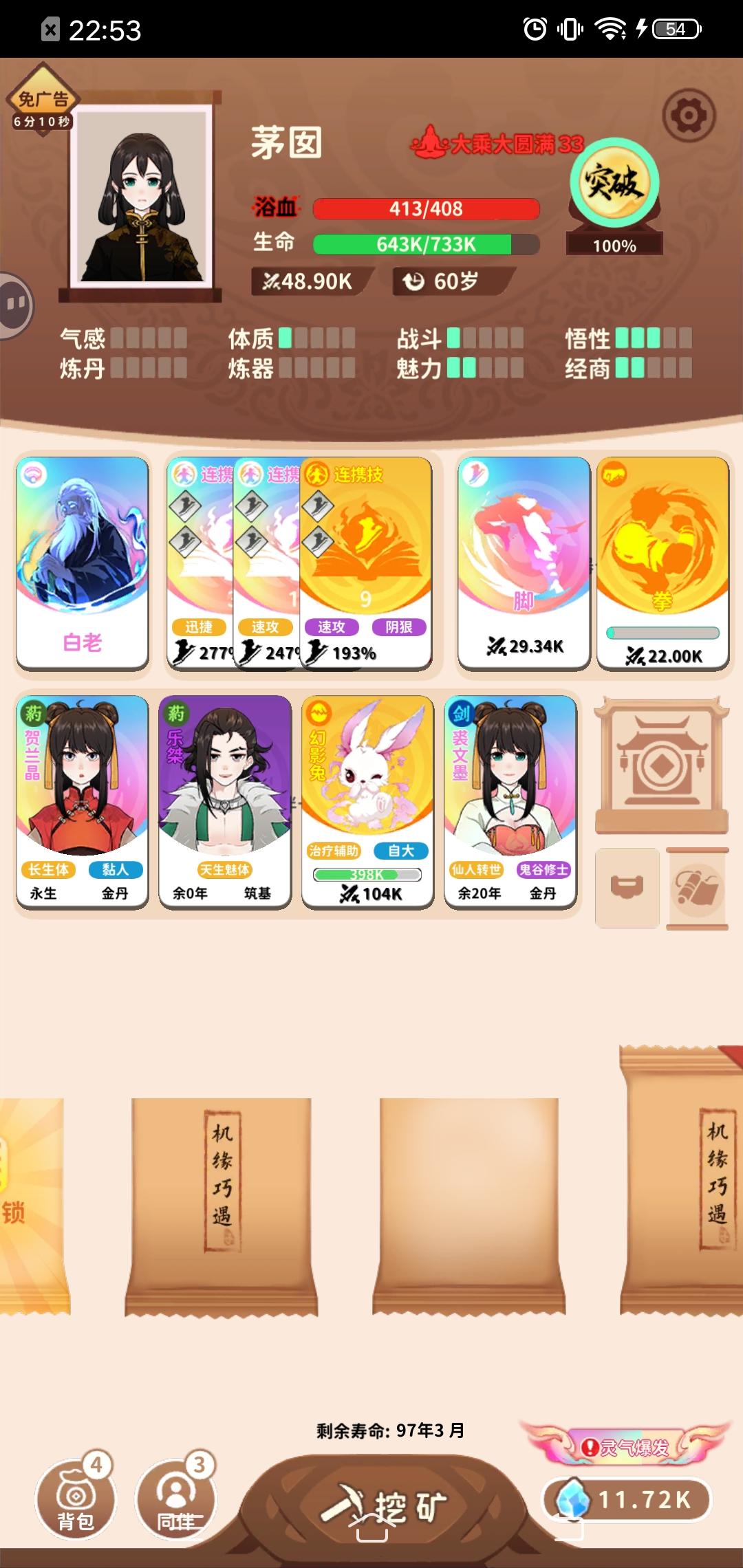 此玩法已有先例,原理是长生枯木大恢复 我复刻一下,不要轻易尝试,手累心累,纯手打了三个小时(用连点方便点不过好像也要三个小时)记下来好多数字,还是因为太枯燥了,晚上6点左右开始打的,从凡人到大乘花了84分钟,乘初上中用了8分钟,中上后卡了我36分钟,但到圆满只花了我2分钟,到圆满又卡我54分钟,突破概率低的坏处,12973和13093岁到时候突然卡了半分