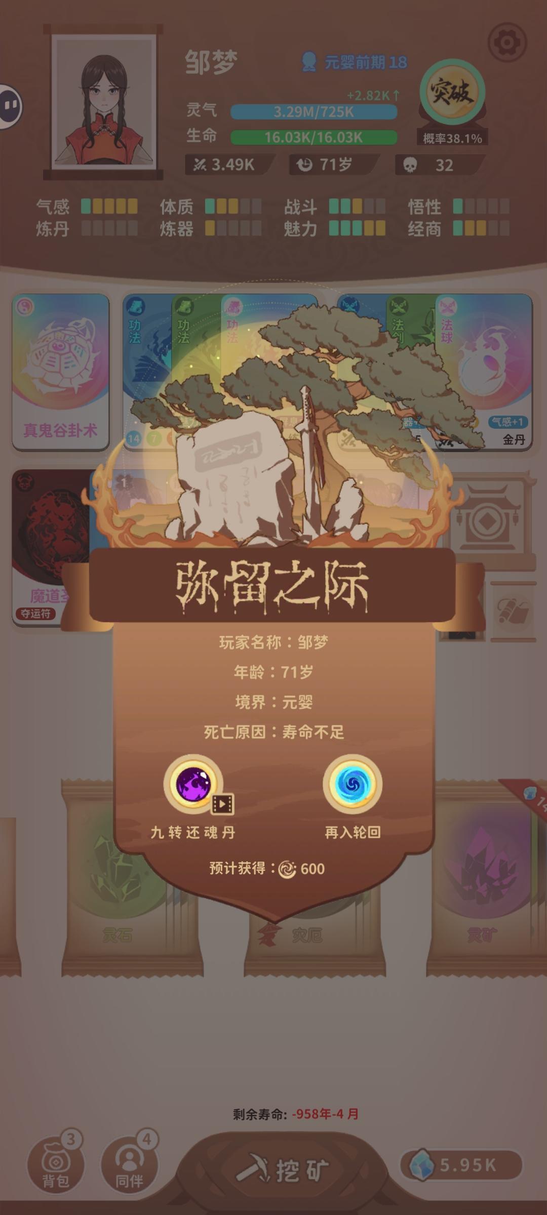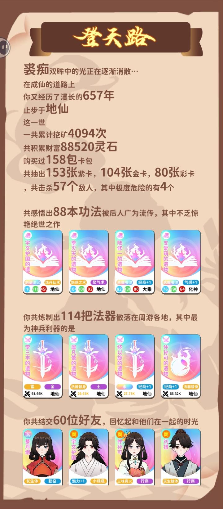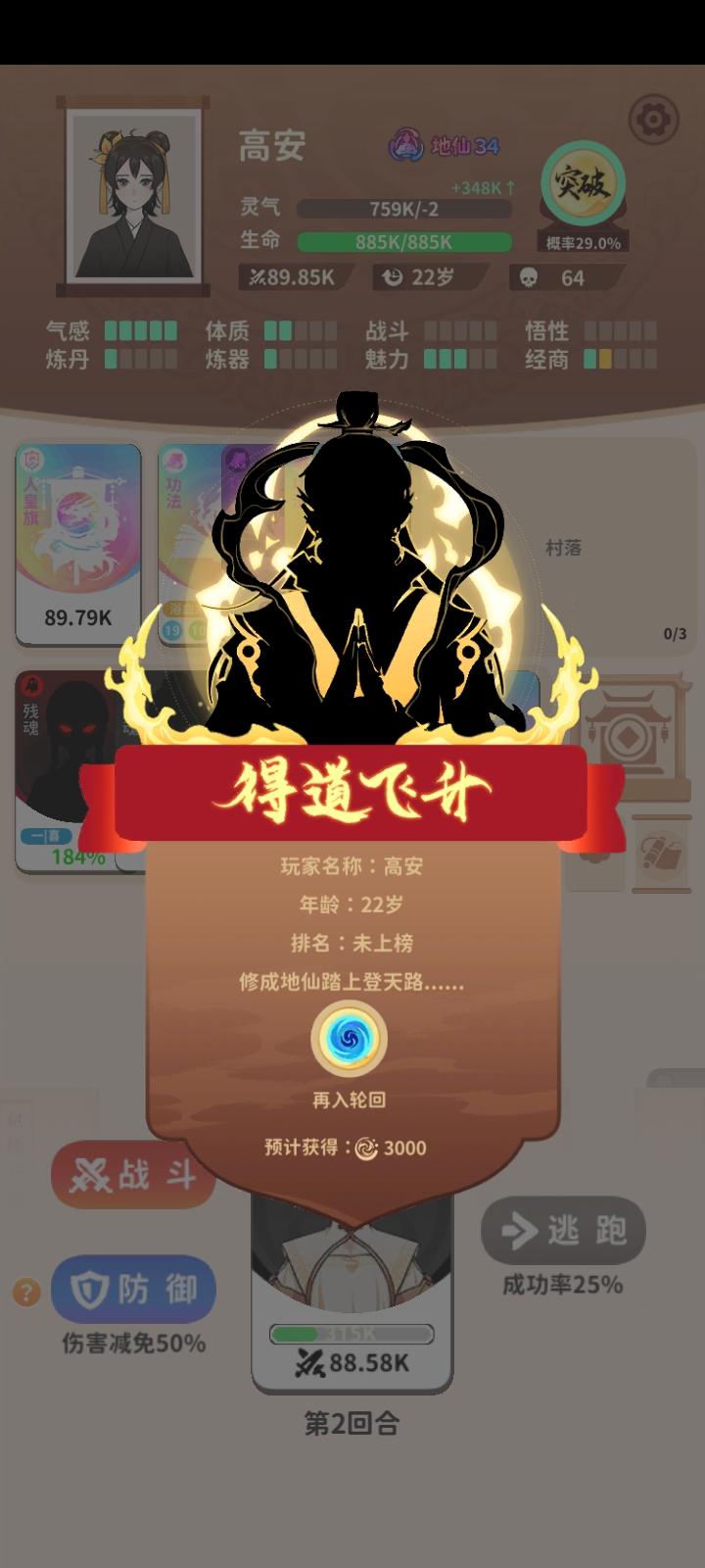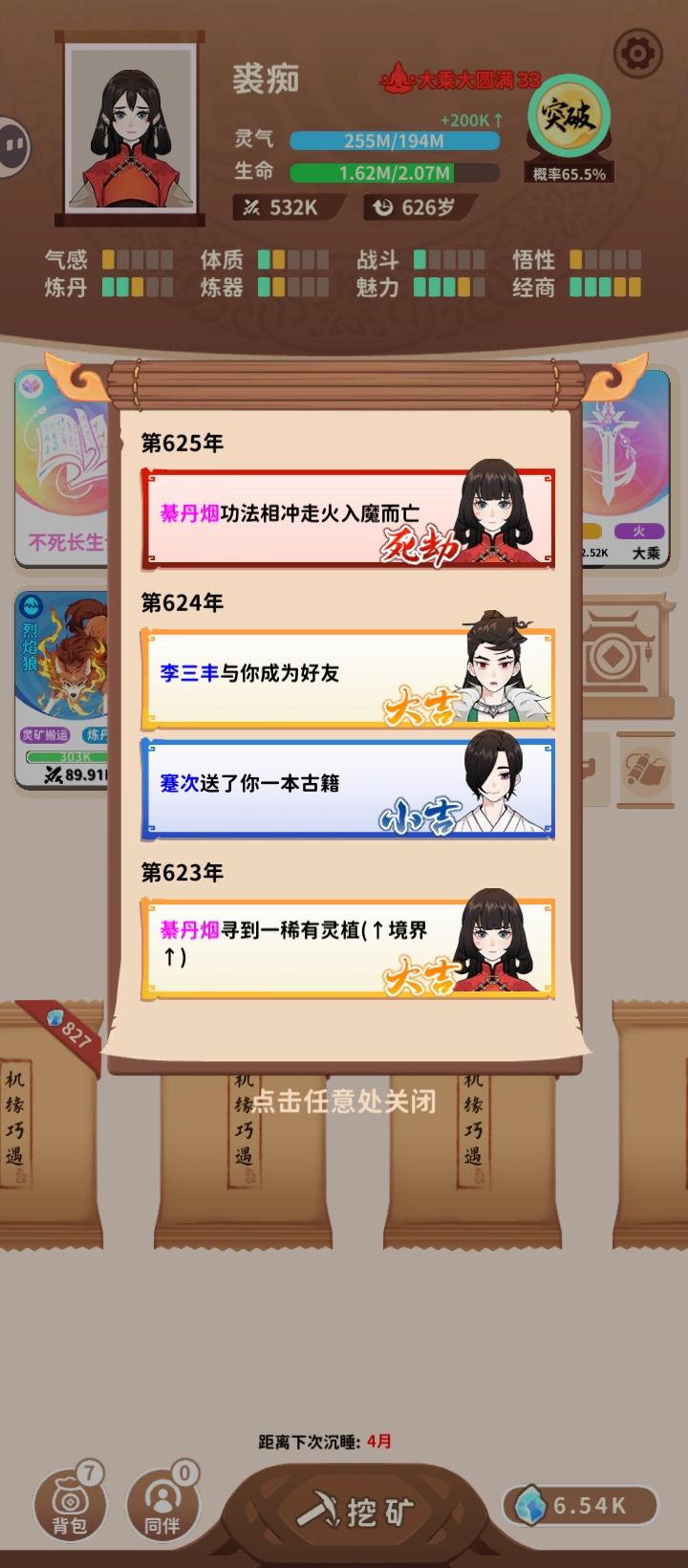 开局刷装备。刷到一个大恢复和枯木逢春一起的。开心坏了。准备看个广告刷一下属性。结果广告里面进去了。点退出来,又刷新了。气得我按了好久。终于,又出了!但是过去好久都没有刷出大回复和恶魔书印。气得我把。功法都丢了。结果下个商店就出了一个390的恶魔封印。偏题了,就是。遇见一个大乘圆满。有寿星词条。八十年寿命。感觉他可以成仙。结果死了。只见过长生体的成仙。你们有没有见过成仙过的,不是长生体#游戏日常