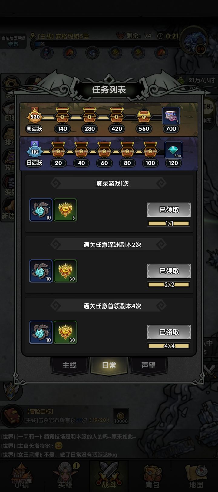 所有任务完成了,110活跃,这是什么bug,游戏做成这样真失败