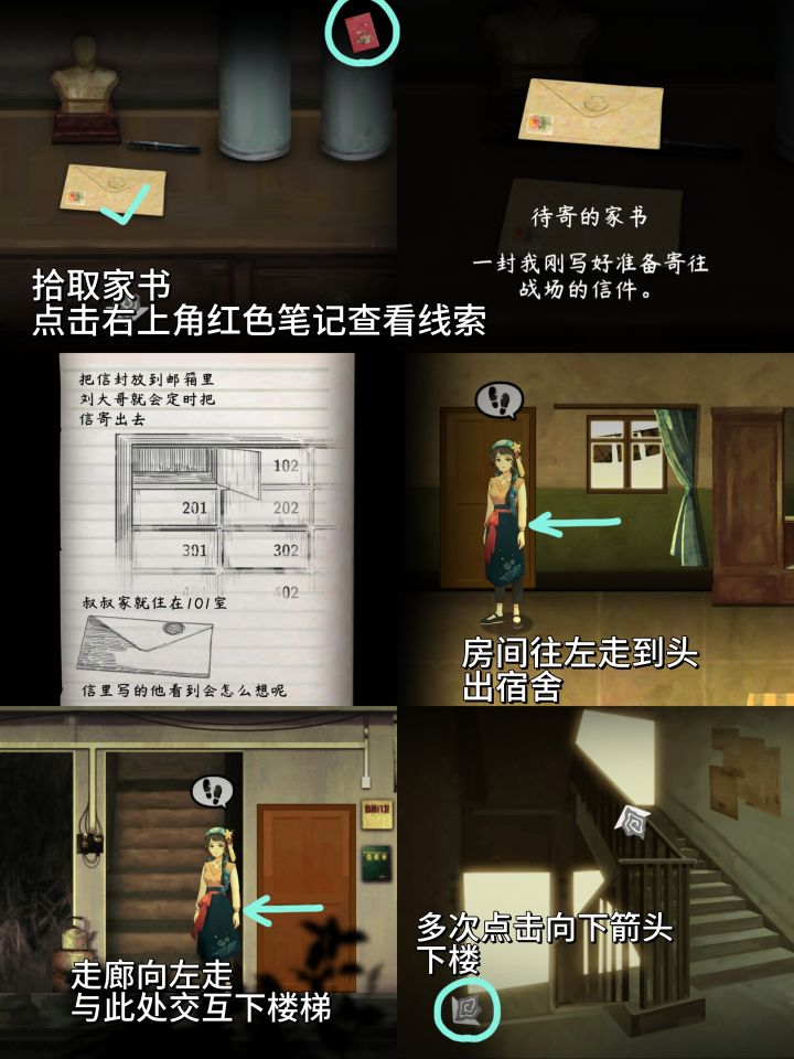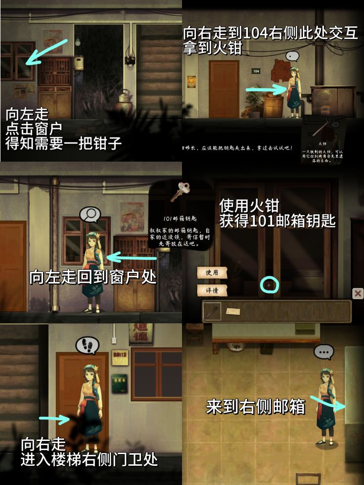 开局我们知道李明来死了。我们开局就下到一楼去。到101和叔叔对话。在房间外面有一个奇怪的人。然后去卫生间点击这里找到衣服然后去镜子前再次和叔叔对话回房间柜子获得钥匙和书。而后再去找叔叔获得清单而后我们出去买东西首先第一个店,容易漏掉的就是银元。第二个店买水果和火柴然后小摊那里买鱼头。然后就能回去了。按照这样摆。把每个楼梯的蜡烛点上。回家把白蜡烛放在电视机旁边。然后去找叔叔