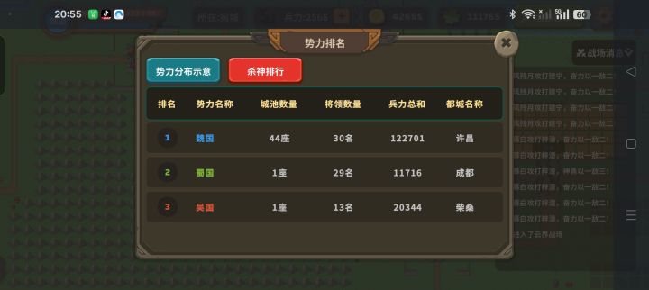 云界大战第二赛季初,魏国拿下不少领土,占据优势。期间二国虽有反扑起到些作用, 但还是难以反制魏国。数日后,魏国在两国势力附近各自驻军上万。 不过,吴国的 一只小猫咪(玩家)奋勇反抗,和一群吴国队友们一起在大战结束时勉强收复回一些失地。第二赛季终究还是由魏国拿下胜利!#策略城池ii