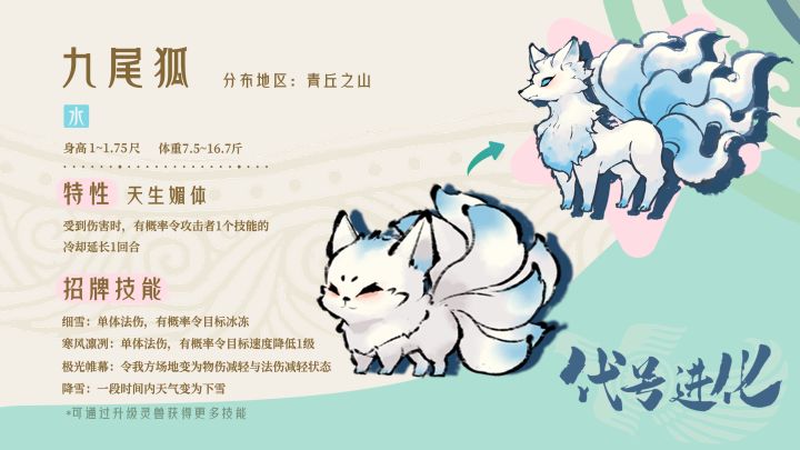 九尾狐身世传说悠久,栖息于神秘的青丘山,天生掌控着水系元素的力量。尽管还是幼年,九尾狐就已经展现出非凡的潜力与魅力。 九尾狐全身毛发洁白如雪,仿佛是从冰雪中孕育而生的精灵。他那一双冰晶般的蓝色眼睛透着灵动与智慧,仿佛能够洞悉一切。九尾狐最引人注目的,是身后那九条柔软的尾巴,每一条尾巴都闪耀着淡淡的青蓝色光辉,宛若夜空中的星光点缀。 作为水系灵兽,九尾狐能够操纵水流,幼年时就展现出了控制水元素的