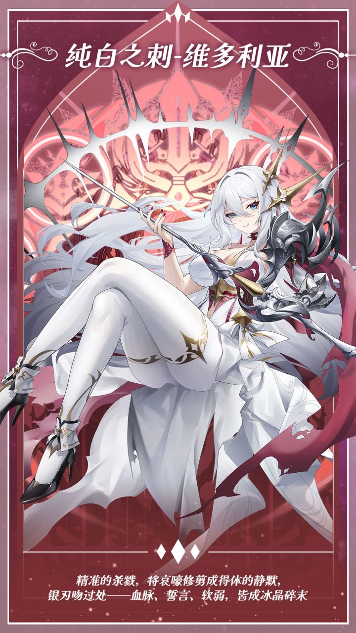 「精准的杀戮将哀嚎,修剪成得体的静默银刃吻过处——血脉、誓言、软弱,皆成冰晶碎末」✦神格故事✦维多利亚·星芒诞生于白塔女巫势力鼎盛时代,曾是公国的末代公主。在公国被万欲脐带摧毁后,她带着家传刺剑投奔白塔女巫,以贵族礼仪重构剑术体系,创立全新剑术流派。为追求剑术极致,她自愿接受白塔的禁忌实验——将预言中毁灭世界的「辉烬星核」碎片植入脊椎,将星辰之力熔铸入剑术之中,而代价是情感逐渐被星辰之