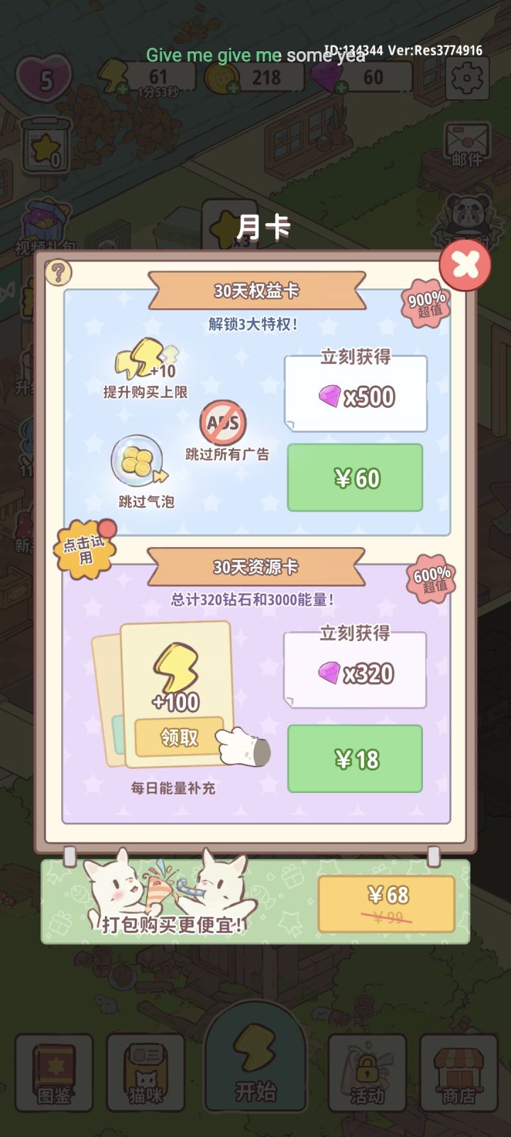 这个游戏合成的部分和肥鹅健身房一模一样,我不知道到底是买了版权还是什么?大家自行观看一下。我来说几个非常雷人的地方。首先,第1点是和这个肥鹅健身房的合成界面一模一样。其次,开服的福利居然只是邮箱里面去领100个体力。第三,看广告我感觉这玩这一个小时我已经看了二三十个广告。我是一个从来都不会吝啬看广告,给厂商支持的人。大大小小的游戏。第四只要合适,我也会氪金。这个氪金界面也是非常的逆天。