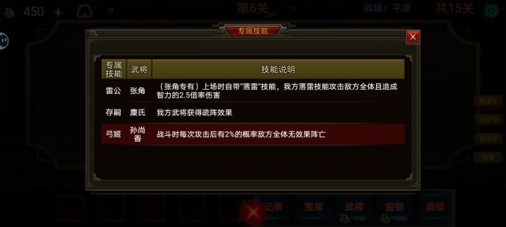 游戏开局进行新手难度的新手教程,按照新手教程了解游戏的基本玩法。点开武将信息框可以查看所有的效果(友情提示:点击属性如“武力”等可以知道属性上限和作用!!!) 之后就是不断检测自己是欧皇还是非酋。运气好,开局就是有专属技能的猛将,如吕布、赵云等,有个主动技能就能体验良好的完成本局游戏,通关会有广告币奖励。运气不行,就不停开始战斗,获得经验提升玩家等级。 玩家等级的提升会增加武将获得时技能多少