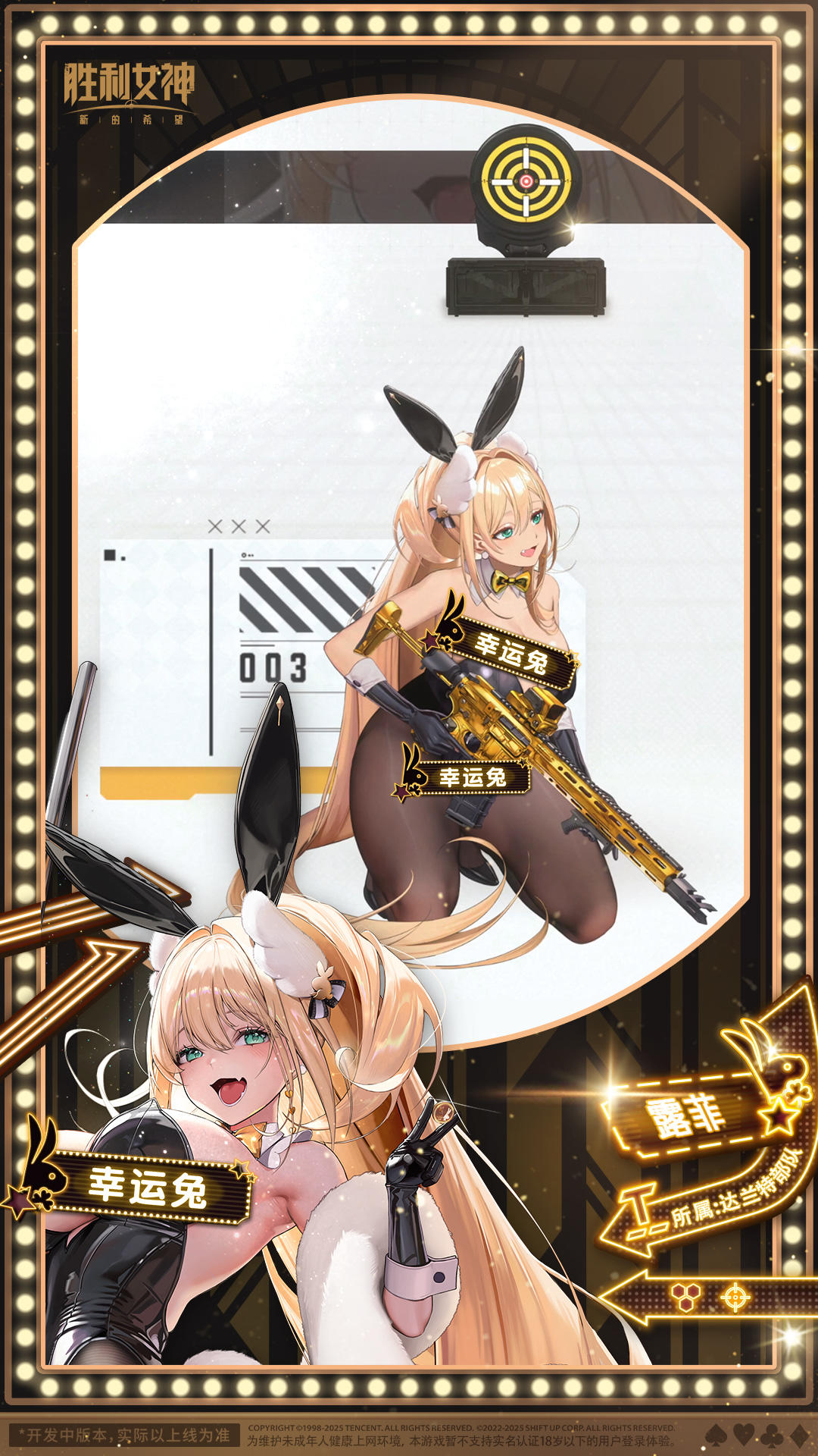 露菲·奢侈兔为金币之战的升级纪念直播而装扮成兔女郎的露菲!包含全新语音、爆裂技能过场动画、姿势、SD特殊动作的露菲全新时装-「奢侈兔」即将登场,可通过时装抽取中获得。*更多获取详情可查看版本更新公告。#胜利女神新的希望