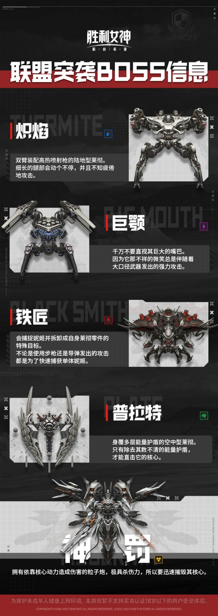 联盟突袭将在2025年6月20日12:00:00开启!▌排名规则优先顺序1 – 依照通关的日期顺序决定排名优先顺序2 - 通关日期相同时,将根据在纪录战达成的累计伤害决定排名。*参与条件:所在联盟等级达到1级各位指挥官可依排名获得联盟芯片。联盟芯片可在联盟商店交换角色,魔方材料等物品。指挥官可在下图中了解更多关于此次联盟突袭BOSS信息#胜利女神新的希望