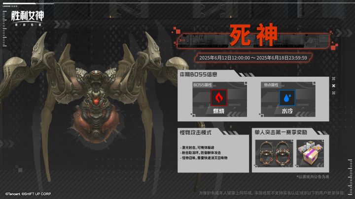 单人突击已经开启!操作多支小队挑战boss,可获得魔方强化材料、珍藏品以及收藏品保养材料等奖励。挑战难度中,以累积伤害最高的为准进行排名,根据排名可获得珠宝奖励和赛季限定头像框。①开启时间:2025年6月11日12:00:00 ~ 2025年6月17日23:59:59②本期BOSS信息- BOSS名称:死神- BOSS属性:燃烧(弱点:水冷)③怪物攻击模式:- 激光射击,可掩体躲避
