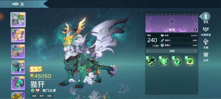 狴犴,又名宪章,中国古代神话中的神兽,也是传说中的龙生九子之第七子。形似虎,平生好讼,却又有威力,狱门上部那虎头形的装饰便是其图像。一、 四维数据狴犴的四维数据:攻击3845 暴击伤害 150% 防御1433 血量218200狴犴定位是个勇猛龙,有一定坦度和较高的伤害。二、 技能方面一技能侵袭:主动效果:狴犴嘶吼冲向目标区域,对沿途碰到的敌人造成总计三次,每次240%攻击力的伤害。技能释