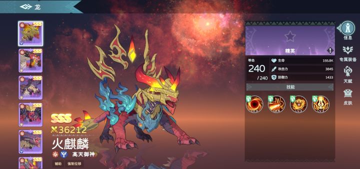 麒麟,口能吐火,吼声如雷,传说中麒麟能为人们带来子嗣,与“龙”“凤”“龟”“貔貅”并称为五大瑞兽。一、 四维数据火麒麟的四维数据:攻击3845 暴击伤害 150% 防御1433 血量155800火麒麟定位是个制造远程范围伤害的睿智龙,拥有优秀的防御力,一定程度保证了自己的生存能力。二、 技能方面一技能黑洞:火麒麟在目标位置创建一个人造黑洞,持续3秒。期间会对所有处于黑洞范围内的敌人造成每