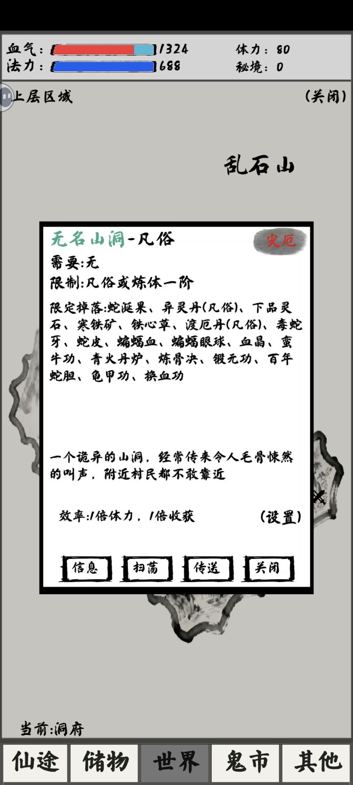进入游戏,我们会发现自带的有练气凡俗功法,凡俗功法练满以后突破成练气就可以加入门派了。去门派藏经阁就可以练气功法。但是门派没有一阶炼体功法,这时候你只需要去无名山洞打一把,然后点开储物袋-消耗-里面学习就行了,这个时候就可以直接开始练体了。