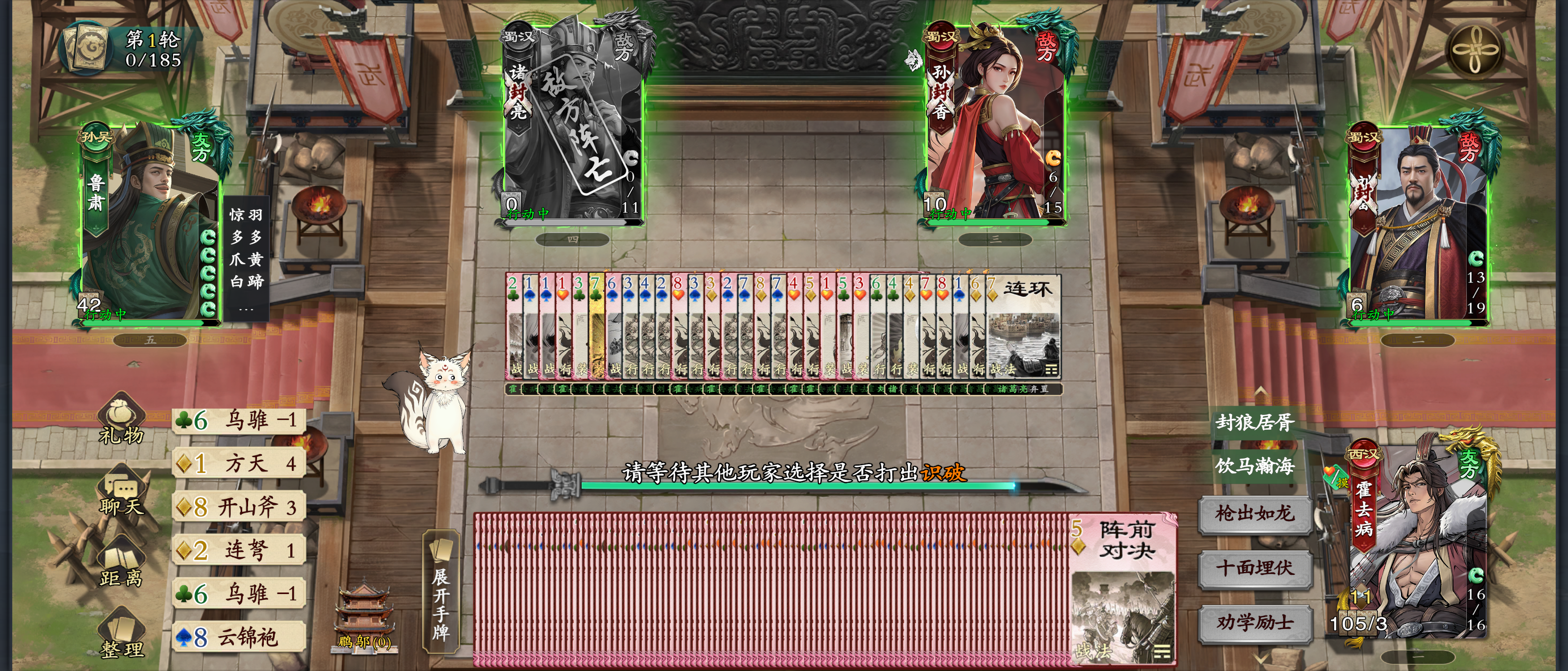 如图,杀完诸葛亮卡住了,显示等待其他玩家打出识破,关键是哥们只用了杀给他干死了啊。重新启动游戏也不好使,只能等进度条结束。这个进度条还巨慢!
