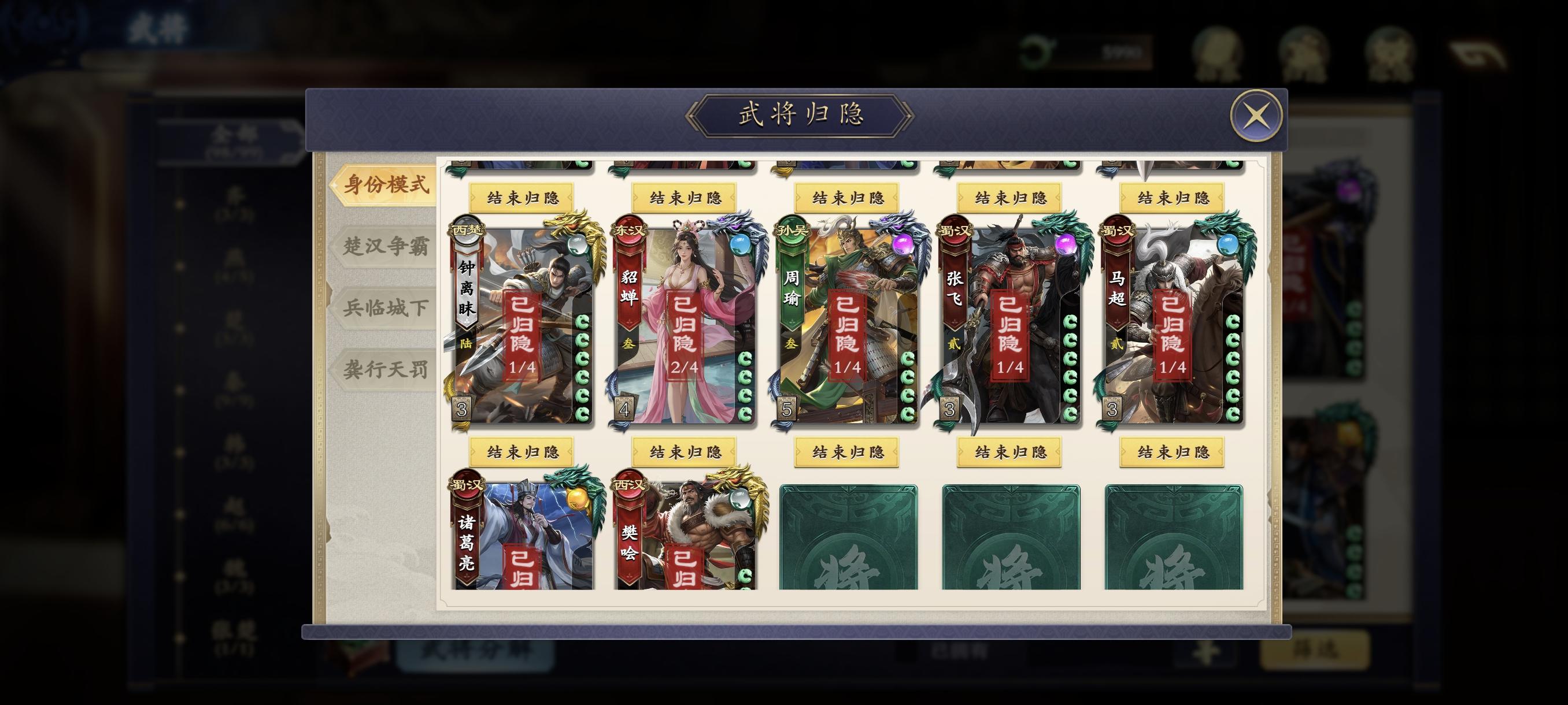 新获得的卫青,我到现在没在选将框看到过。想玩只能去训练场体验一下。游戏更新到后期武将越出越多,每获得八个武将才能归隐一个,这也太少了。