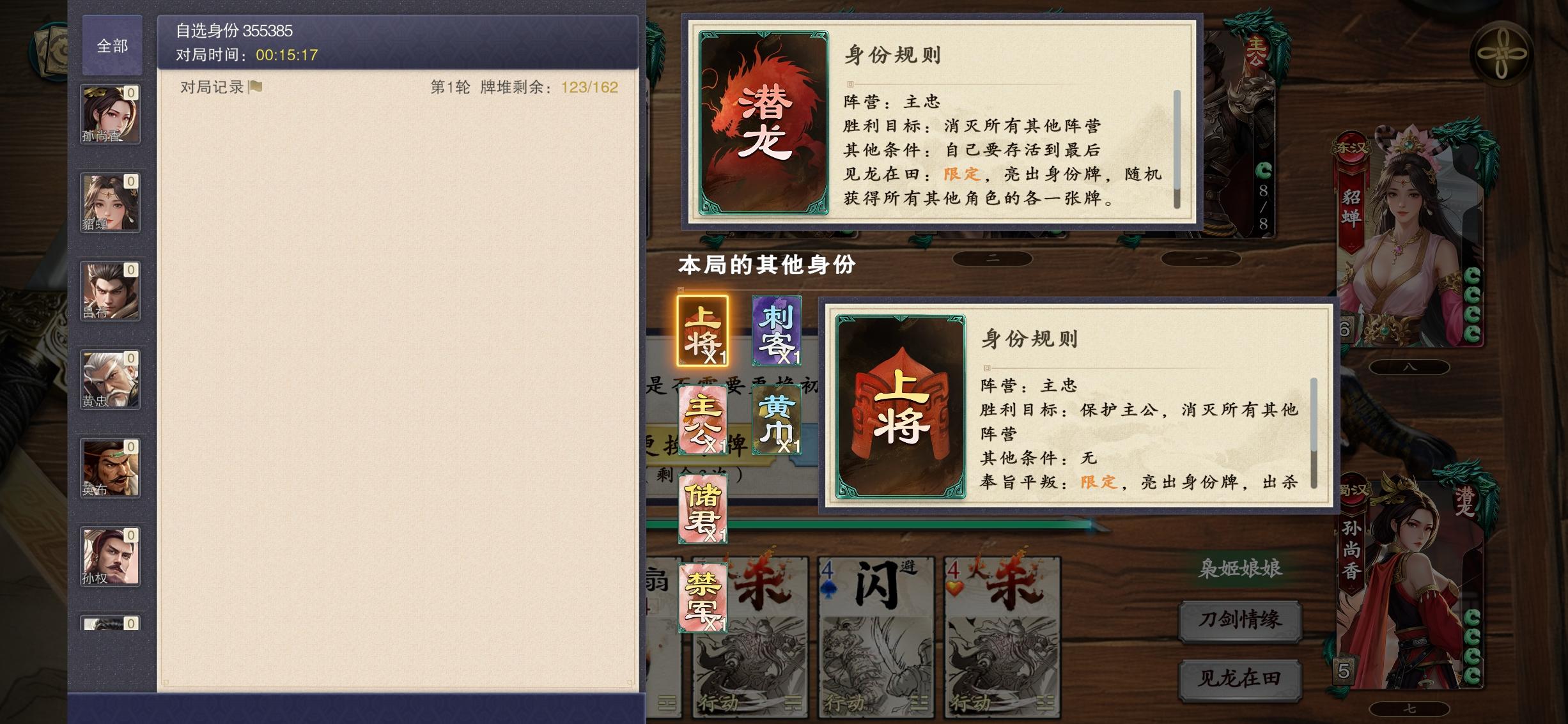 身份场左上角的本局身份显示,应该是BUG,所有身份的数量都显示是1,这局上将有2个。另外虽然身份阵营有做卡面颜色区分,但是有些人看不清或者不知道有颜色区别,上将技能描述里写的“阵营:主忠”容易被误解成是主公方的,实际上是潜龙的忠臣。建议把不同阵营区分开,同一阵营的身份放在一起易于区分,并且在介绍里写明阵营:主公1/主公2/潜龙/反贼/黄巾/独立等