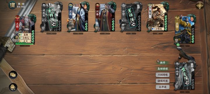 甘罗,3体力,3手牌上限说张赴燕:每个回合限1次,你可以弃置一名其他角色与你的各一张牌,依次比较:点数是否大于;属性是否被克制;牌名是否为杀。其不占两项或更多时,你交换其与另一名其他角色的位置。谈兵得城:每个其他角色限1次,你可以用一张杀交换距离为1的一名其他角色的两张手牌,然后交给另一名其他角色。十二拜相:限定,其他角色获得你的牌后,若手牌数为全场最高,其可以弃置任意张牌,令你增加等量的体