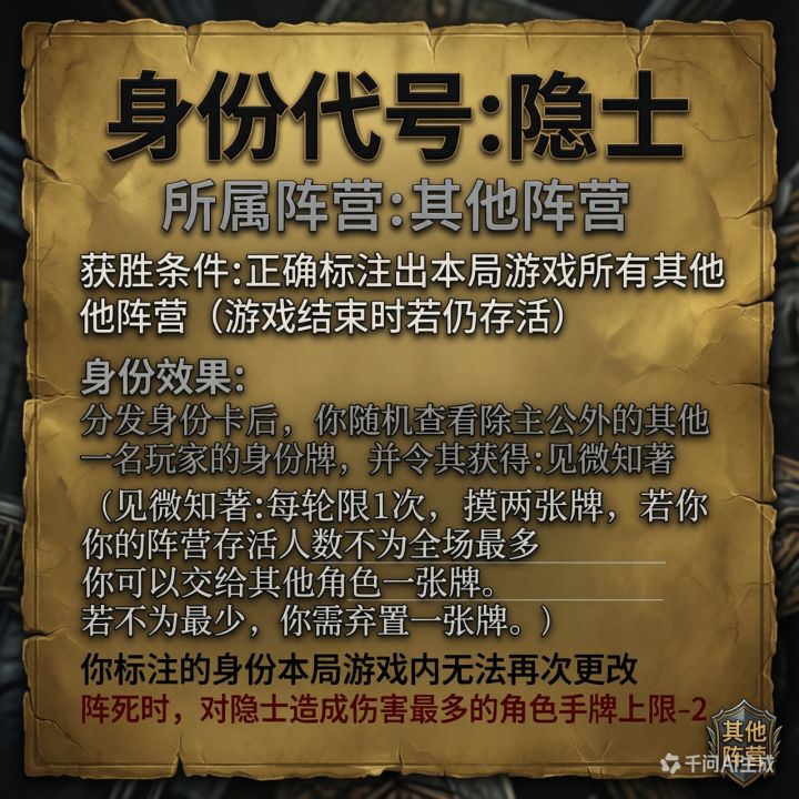 #名将杀百业天工身份代号:隐士所属阵营:其他阵营获胜条件:正确标注出本局游戏所有其他阵营(游戏结束时若仍存活)身份效果:分发身份卡后,你随机查看除主公外的其他一名玩家的身份牌,并令其获得:见微知著 (见微知著:每轮限1次,摸两张牌,若你的阵营存活人数不为全场最多 你可以交给其他角色一张牌。若不为最少,你需弃置一张牌。 )你标注的身份本局游戏内无法再次更改阵亡时,对隐士造成伤害最多的