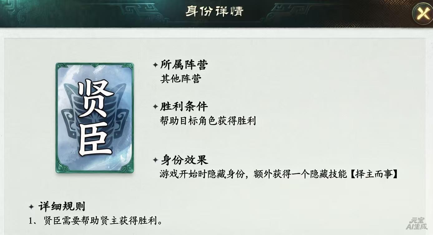 #名将杀百业天工 身份代号:贤臣阵营属性:其他阵营 获胜条件:帮助目标角色获得胜利身份效果:游戏开始时隐藏身份,额外获得一个隐藏技能【择主而事】择主而事:游戏开始时,你秘密地选择一名其他角色,称为贤主。限定,若你与贤主均存活,你可以在出牌阶段亮出身份牌,本局游戏你与该角色每获得过8张牌,你就可以与其各摸1张牌;你与该角色每击杀过1名角色,你与其同时体力上限+1并回复1点体力详细规则:
