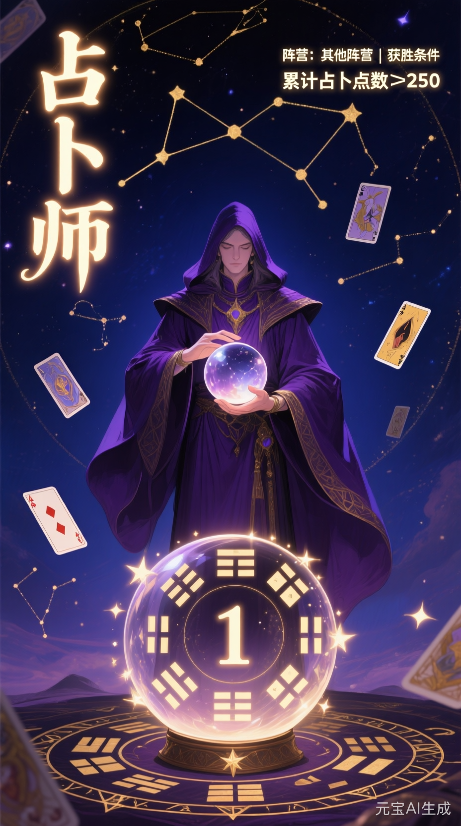 #名将杀百业天工 身份代号:占卜师阵营:其他阵营获胜条件:所有占卜累计点数大于或者等于250。身份效果:获得限定技-公开身份,让所有玩家都占卜一次。身份规则:当占卜师在场时,每个玩家回合开始会卜卦一次,并且这个玩家会根据卜卦获得不同效果。1-摸1张牌,2-失去1体力上限,3-加1体力上限,4-随机弃1张牌,5-加1手牌上限,6-减1手牌上限,7-加1装备上限,8-减1装备上限。