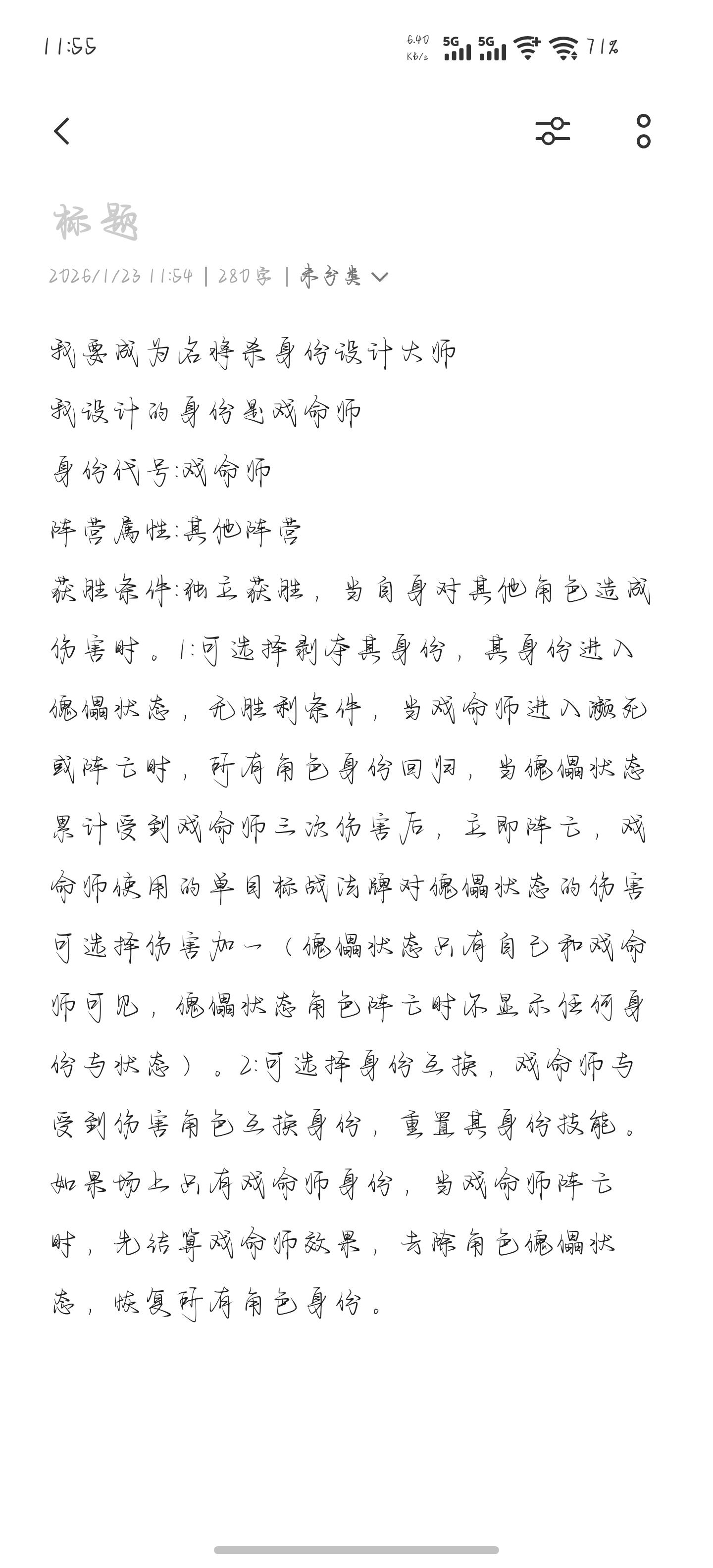 #名将杀百业天工 我设计的身份是戏命师身份代号:戏命师阵营属性:其他阵营获胜条件:独立获胜,当自身对其他角色造成伤害时。1:可选择剥夺其身份,其身份进入傀儡状态,无胜利条件,当戏命师进入濒死或阵亡时,所有角色身份回归,当傀儡状态累计受到戏命师三次伤害后,立即阵亡,戏命师使用的单目标战法牌对傀儡状态的伤害可选择伤害加一(傀儡状态只有自己和戏命师可见,傀儡状态角色阵亡时不显示任何身份与状态)。
