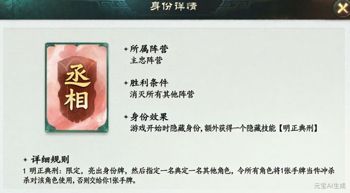 #名将杀百业天工 身份代号:丞相阵营属性:主忠阵营获胜条件:消灭所有其他阵营身份效果:游戏开始时隐藏身份,额外获得一个隐藏技能【明正典刑】明正典刑:限定,亮出身份牌,然后指定一名其他角色,令所有角色将1张手牌当作冲杀对该角色使用,否则交给你1张手牌。详细规则:1. 需要保护自己阵营的主公,自己阵营的主公阵亡后,丞相会直接游戏失败并离开对局2. 技能【明正典刑】在丞相的出牌阶段才能发