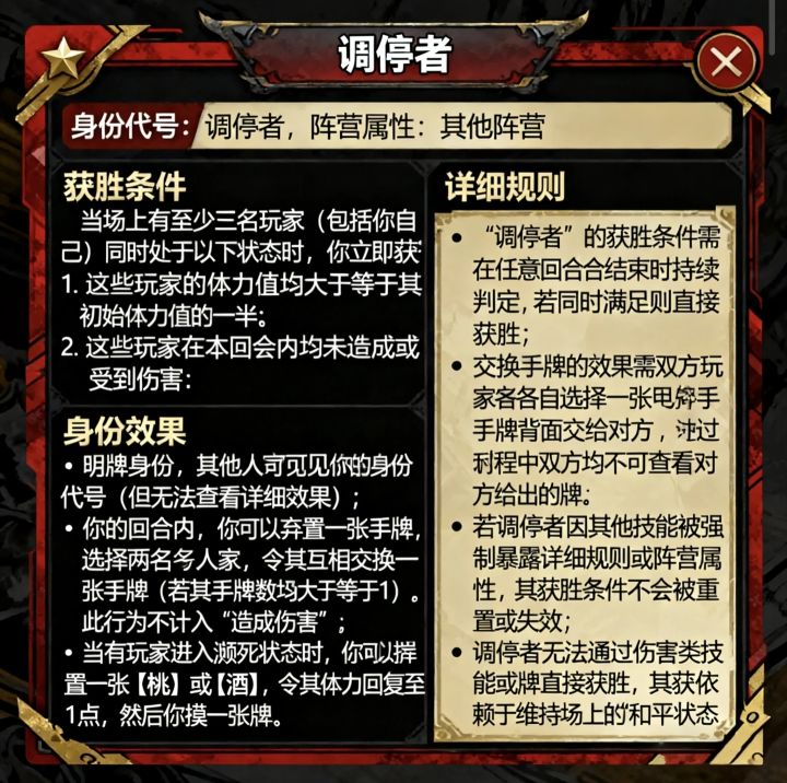 #名将杀百业天工 这是我设计的身份身份代号:调停者阵营属性: 其他阵营获胜条件:当场上有至少三名玩家(包括你自己)同时处于以下状态时,你立即获胜:1. 这些玩家的体力值均大于等于其初始体力值的一半;2. 这些玩家在本回合内均未造成或受到伤害;3. 这些玩家属于至少两个不同阵营。身份效果:· 明牌身份,其他玩家可见你的身份代号(但无法查看详细效果)。· 你的回合内,你可以弃置一