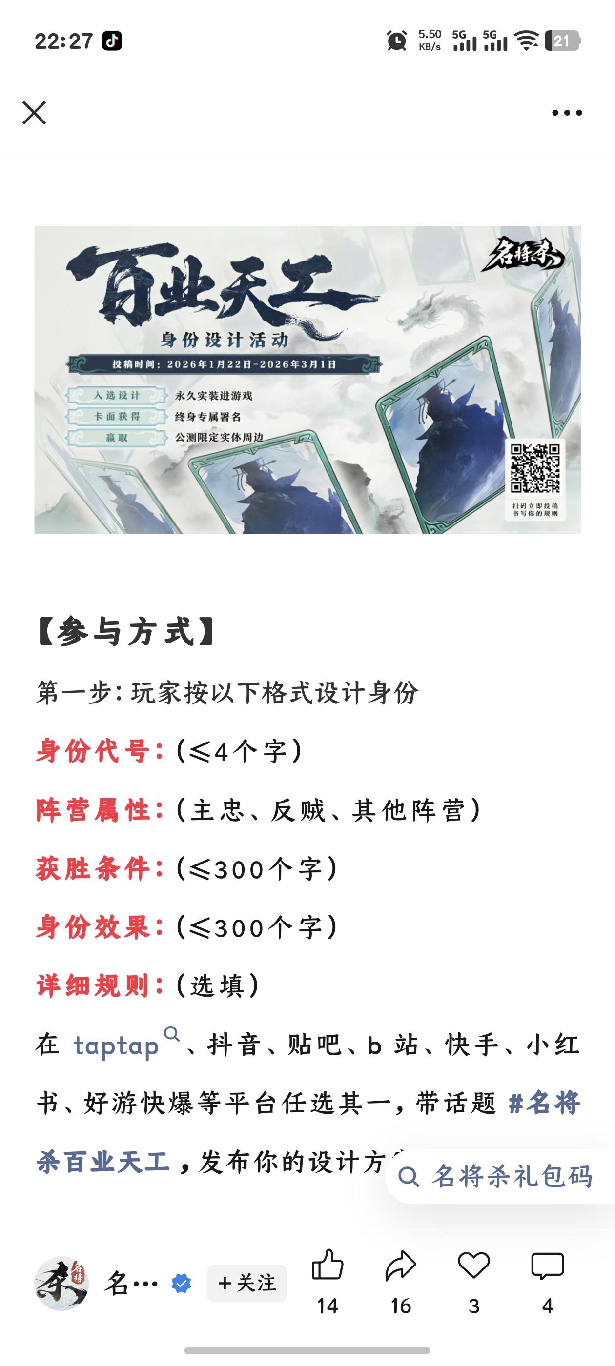 #名将杀百业天工 我设计的身份是义军身份代号:义军阵营属性:其他阵营获胜条件:消灭所有其他阵营身份效果:隐藏身份,当你对主忠或反贼阵营杀伤三次以上时,则自动加入其中并明示身份,你的获胜条件变更为加入后的获胜条件。