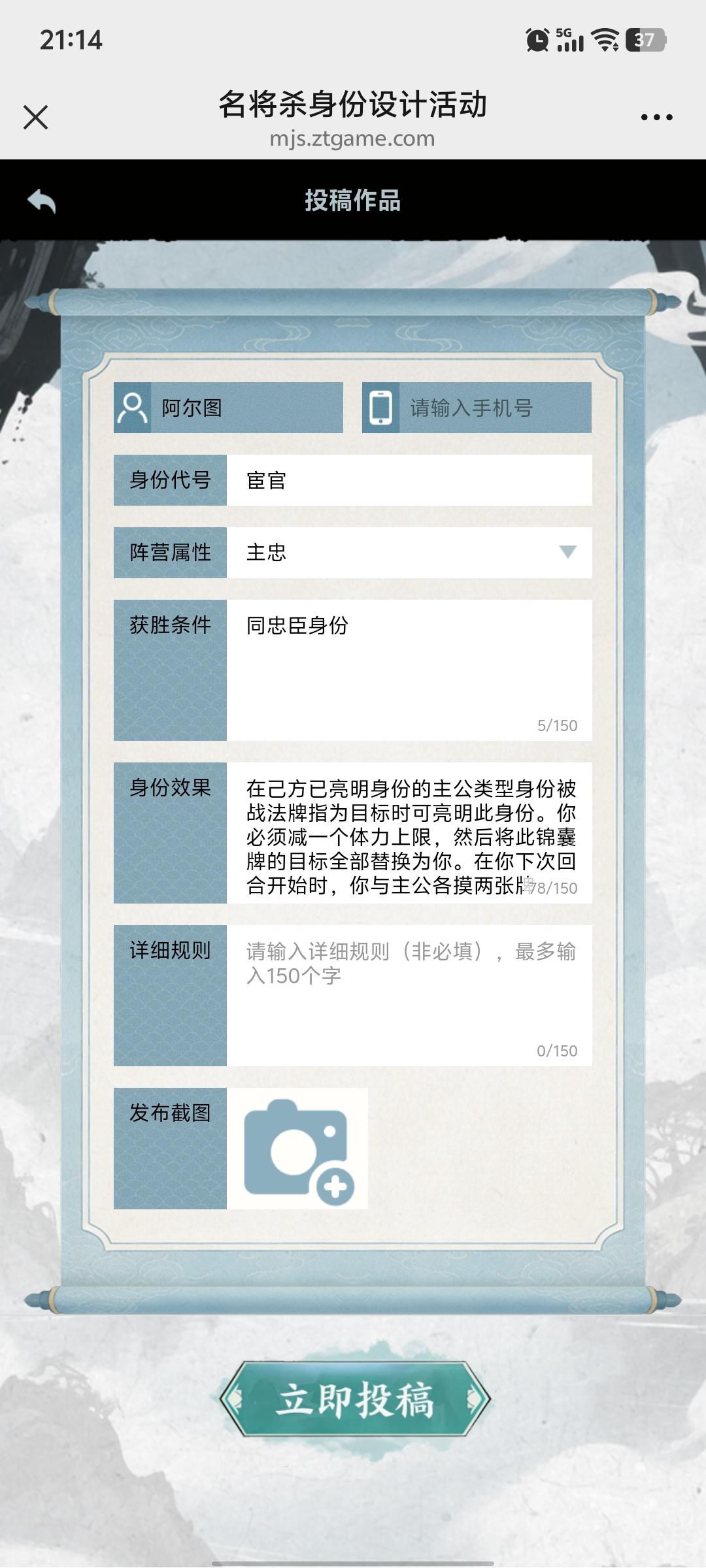 #名将杀百业天工 #名将杀 身份阵营:其他获胜条件:亲手击败任意两名其他角色,若主公阵亡,或场上只剩下一名角色,则你跟随阵亡有一个特殊技能:奸臣弄权:你可以公开身份牌,本回合造成的所有伤害加一且你的杀具有强命。回合结束后你阵亡