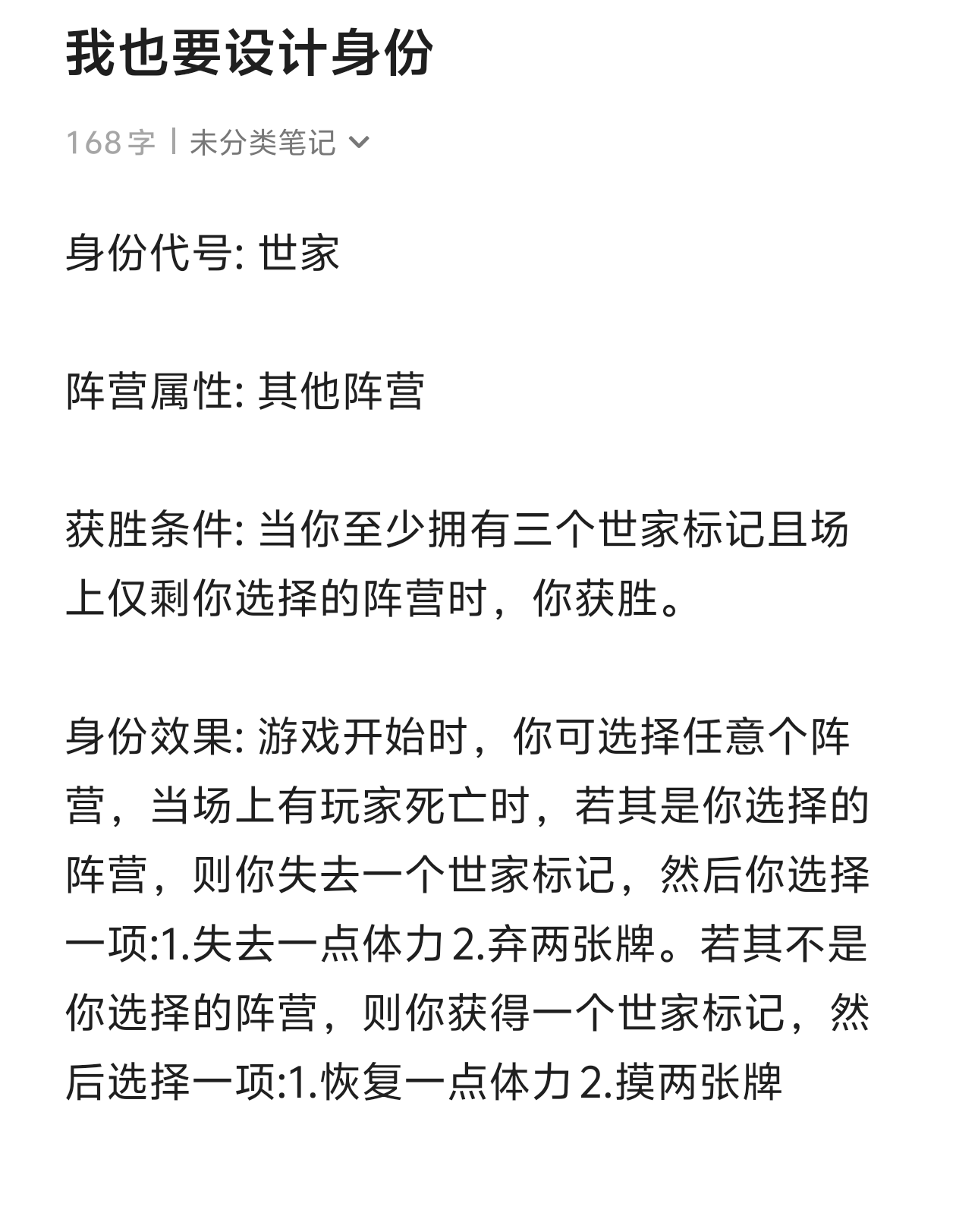 我设计的身份是世家身份代号: 世家阵营属性: 其他阵营获胜条件: 当你至少拥有三个世家标记且场上仅剩你选择的阵营时,你获胜。身份效果: 游戏开始时,你可选择任意个阵营,当场上有玩家死亡时,若其是你选择的阵营,则你失去一个世家标记,然后你选择一项:1.失去一点体力2.弃两张牌。若其不是你选择的阵营,则你获得一个世家标记,然后选择一项:1.恢复一点体力2.摸两张牌#名将杀百业天工 #名将杀
