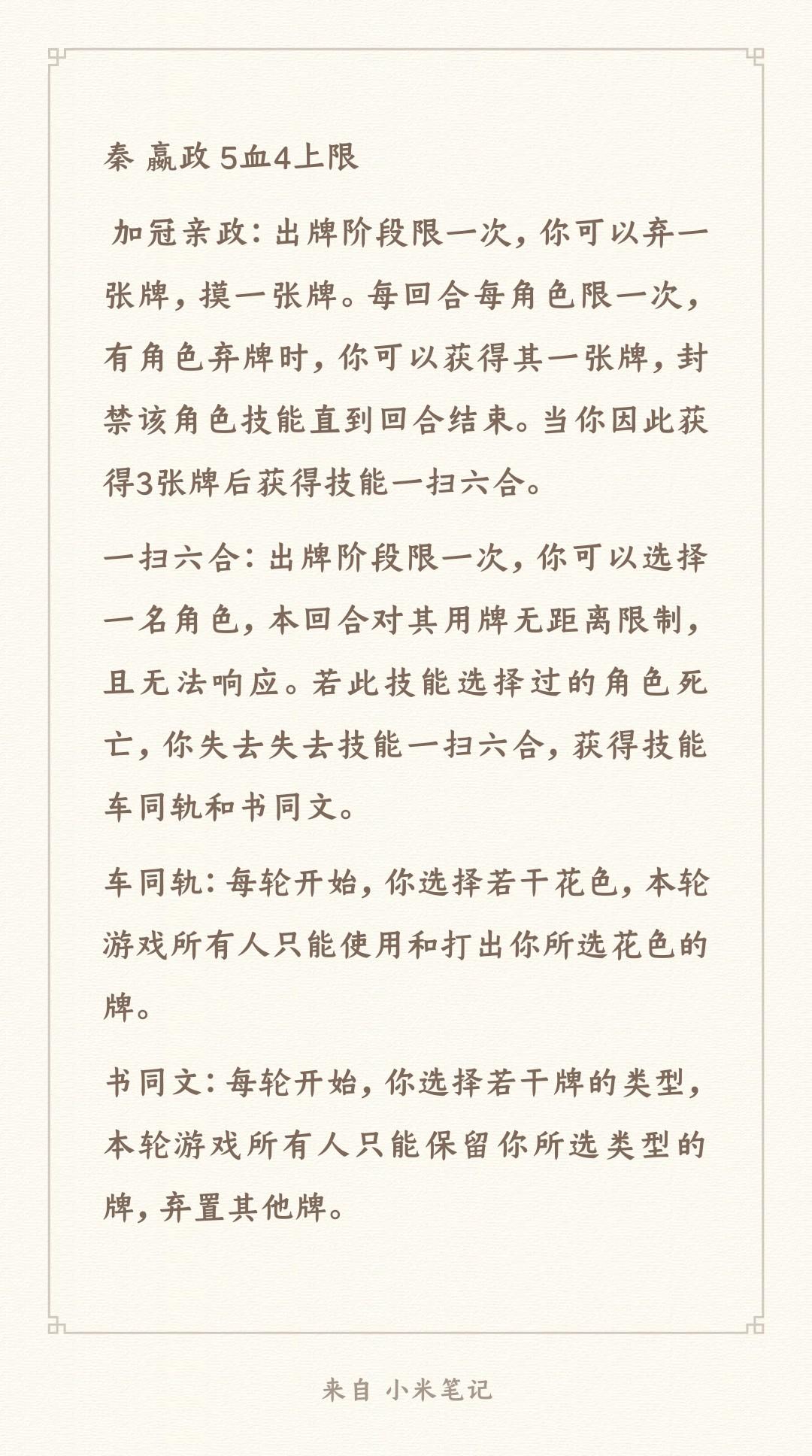 一技能和李斯赵姬有联动和吕不韦也算有点联动。发动3次觉醒是对应嬴政处理赵姬,吕不韦和任用李斯这三件事。 二技能就是表述一扫六合 三和四技能表示嬴政大一统制定律法和规则,设计的控场技 第一次设计杀牌武将,大家多提提建议