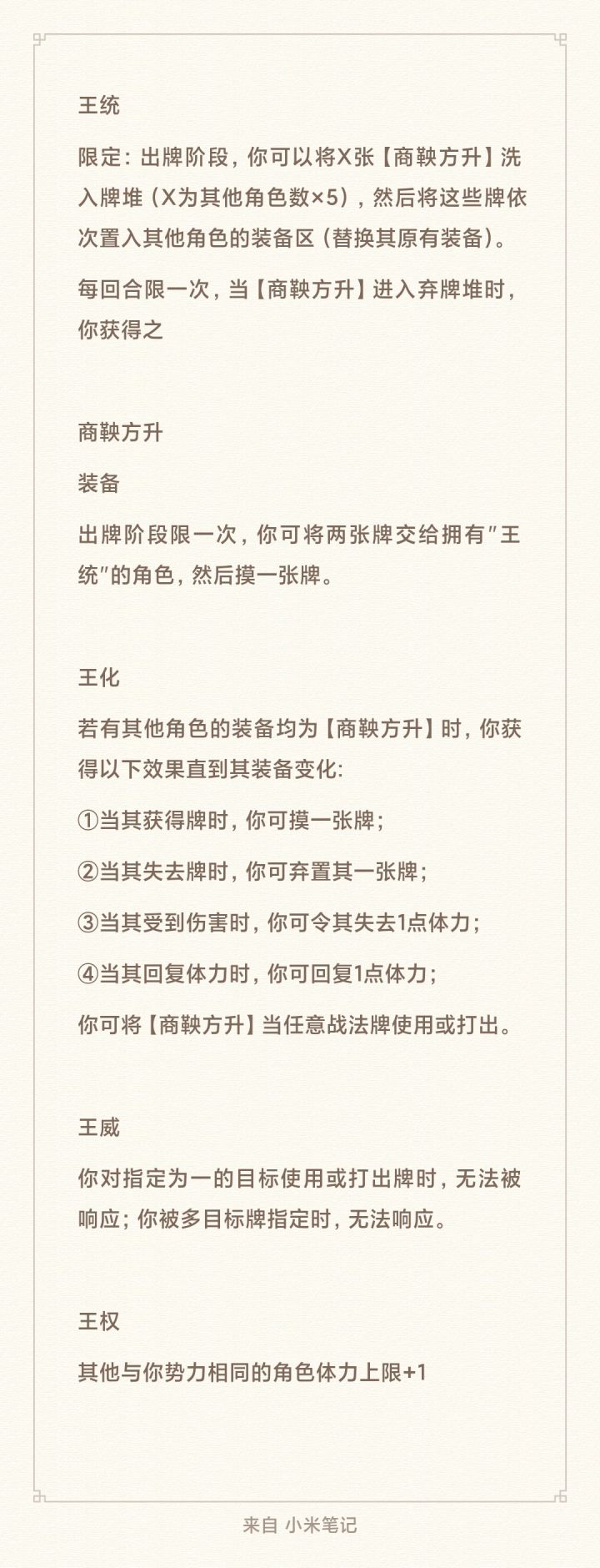 赵匡胤 势力:北宋 5体力/4手牌上限 品质:传说 【黄袍加身】 ①其他角色出牌阶段限一次,令你获得一个出牌阶段。 本次出牌阶段内,当你打出装备牌时,装备在其他角色身上,你与其摸一张牌。 ②当你获得三次出牌阶段,你可以失去此技能,获得[兵无常帅,帅无常师] 【杯酒释兵权】 出牌阶段每名角色限一次,你交给其他角色一张手牌,你获得其装备区所有装备。 你的装备牌不计入手牌上限。 [兵