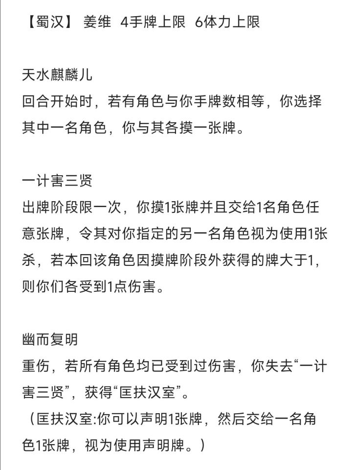 九伐中原:出牌阶段限一次,你可以弃置一张牌或失去一点体力上限,令一名其他角色交给你一张牌并使你出杀次数加一,否则你失去一点体力并对其造成一点伤害;使用九次后失去此技能,并获得穷兵黩武。(穷兵黩武:你可以消耗所有出杀次数视为对攻击距离内角色的使用等量杀,此技能每造成一次伤害摸一张牌,每次未造成伤害随机失去一张牌,此技能失去牌不足时则每张失去一点体力。)天水麒麟儿:每当你受到伤害或失去体力时,可失去