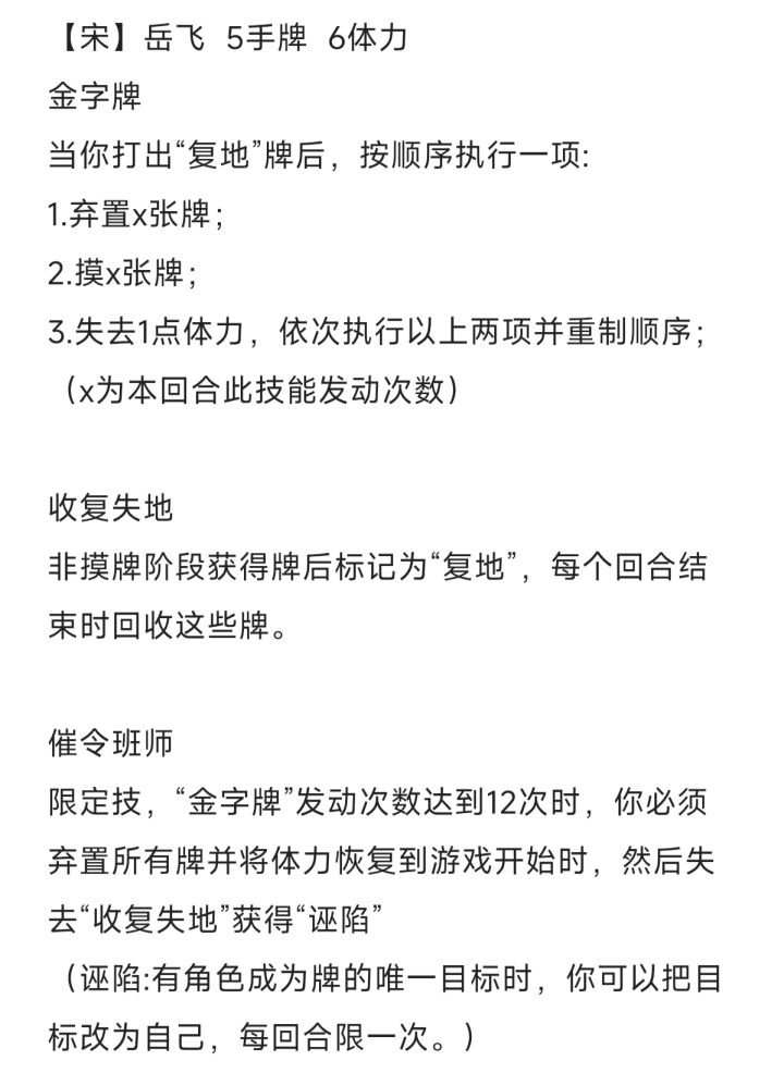 魏 蜀汉5血4手牌1.天水麒麟儿(九伐中原)出牌时,摸一张牌。(过牌40张时换成九伐中原)九伐中原出牌时,摸一张牌,如果是战法牌时改换成不记次数火杀牌(牌型:战法牌,麒麟剑)2.继承丞相之志(被动技能)濒死时,回复1血并获得强化版八卦盾(八卦盾一回合一次,自动运转一次,离了姜维就删除此装备)。3.限定技(暂时)守卫剑阁(势力:剑阁)主公阵亡时,姜维跟攻击距离为一的对手,有过杀闪