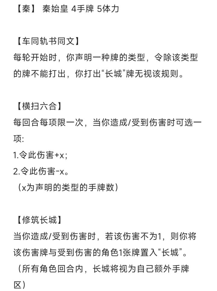商鞅 秦 4/5徙木立信:游戏开始,你将全场角色数两倍的牌置入“赏金”。当有角色造成伤害/摸牌阶段外摸牌/弃牌阶段外弃牌时,其可以从“赏金”中随机获得一张牌,当“赏金”中没有牌时,你失去此技能,获得技能“变法”“励民生息”“军功授爵”。变法:令所有角色获得技能“连坐”。 出牌阶段限一次,你可以弃置一张牌,令两名角色变换位置,若这些角色上轮游戏获得过其他角色的牌,失去一点体力。 连坐:距离为