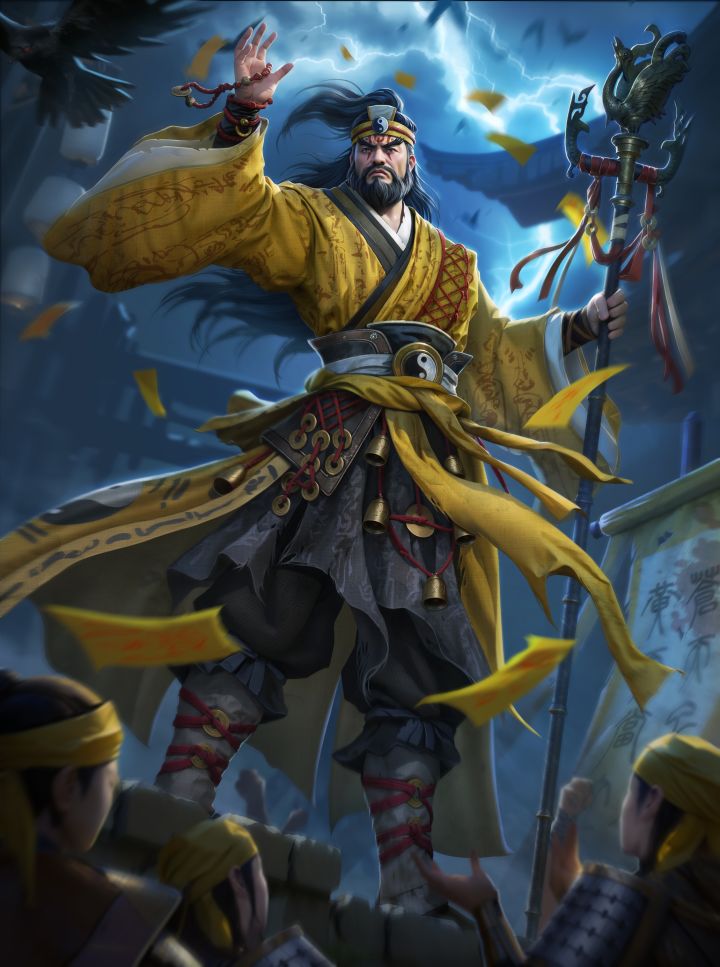 太平道:其他角色每回合限一次,可以交给你两张牌,其使用一张符水诡雷妖术:游戏开始或你的回合开始时,指定一名其他玩家,获得妖术标记;你与拥有妖术标记的角色手牌及进入手牌的所有种类的杀均转化为雷杀驱雷掣电:你免疫雷属性伤害;当一名角色受到雷属性伤害时你可以选择令其随机弃置一张牌神兵利器:你无法装备武器,在出牌阶段开始时你可以选择任意一种武器获得其效果。回合结束失效。太平要术#名将杀 :