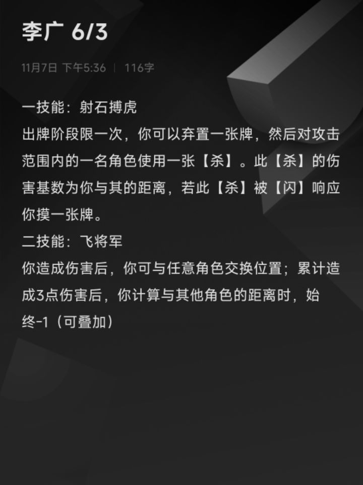 #名将杀pv脑洞 赵国李牧5血3手牌上限【坚壁清野】每个回合限1次,当你成为牌的目标,你可以将任意张牌按顺序放回牌堆顶,若如此做,此角色回合结束后,跳过牌堆顶1张牌并从牌堆摸等量张牌。【避其锋芒】每个回合限1次,当你受到伤害时,你可以将1张牌转换为专属战法牌并可以立即打出。燎原之火:选择一名角色,视为打出1张具有强中的火杀。临阵倒戈:选择2个相同势力角色互相视为打出1张杀。出谋