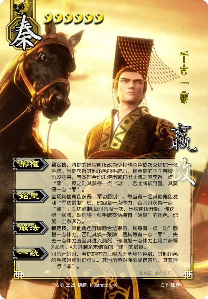 本来想搞嬴政的,上机制堆强度搞点小作文,但搞崩了,堆砌一片一片的,改了几次还是不如意,小作文就这点不好。就删删改改改成了胡亥。感觉好多了。管你这那的都给我有罪就完了。懂不懂什么叫秦二世啊。